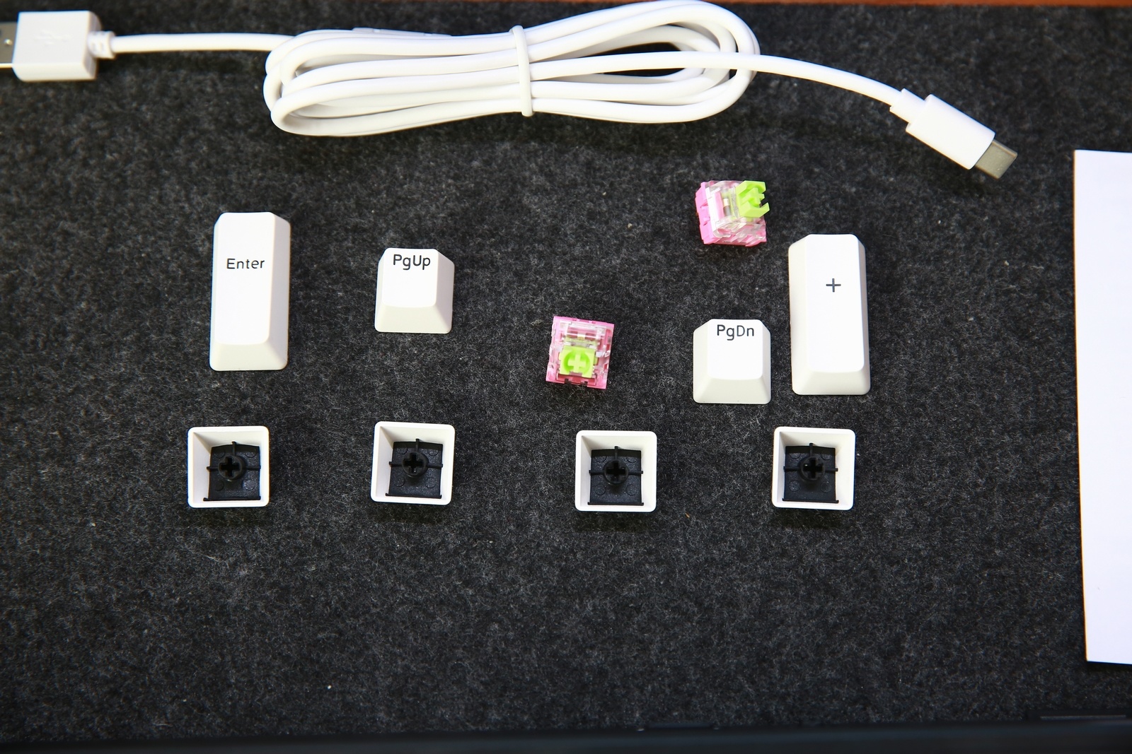 先看配件,一根USB线,两颗增补轴体,两个键帽,以及一套拔键器和拔轴器。一般键盘增补键帽都是ESC、回车和空格等,而阿考斯BC98的两颗增补键帽是PgUp和PgDn,比较少见,后面我会说明原因。