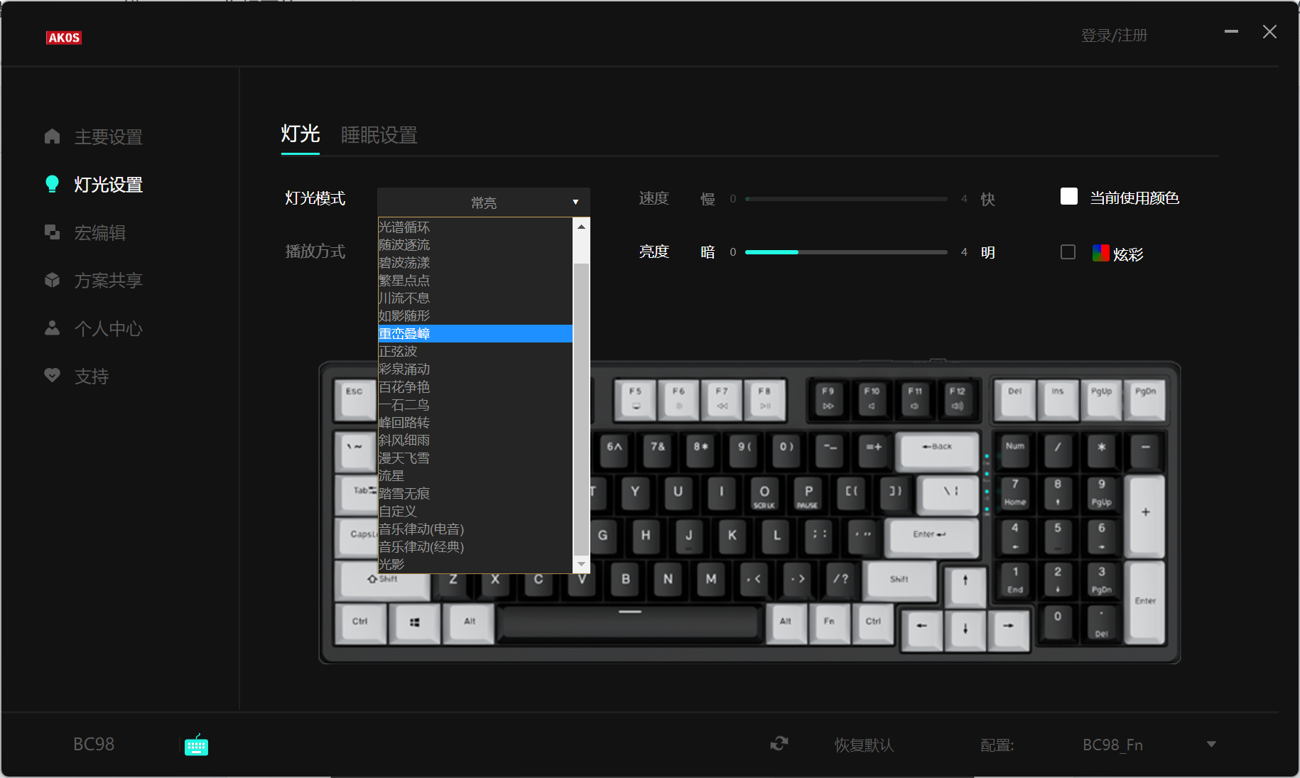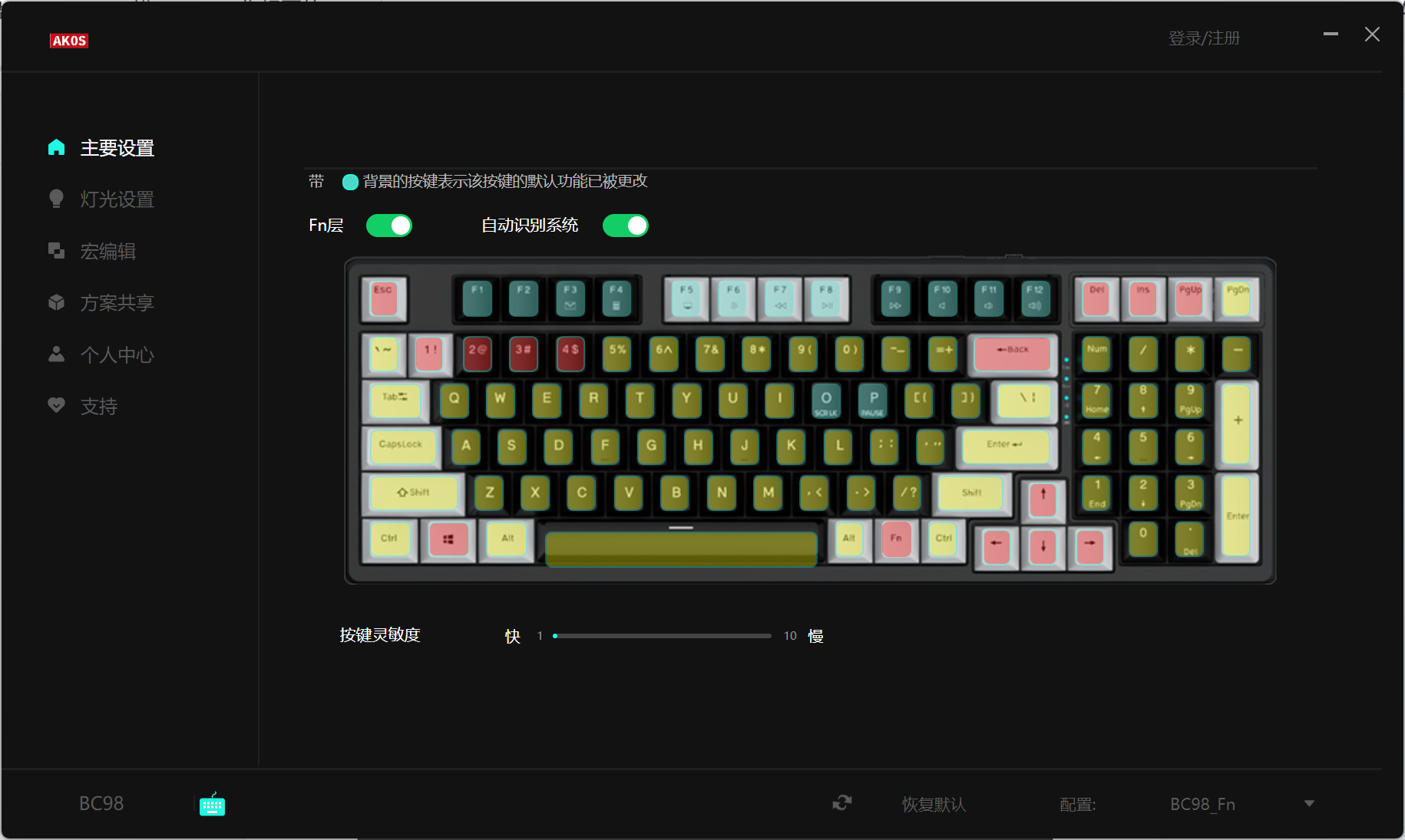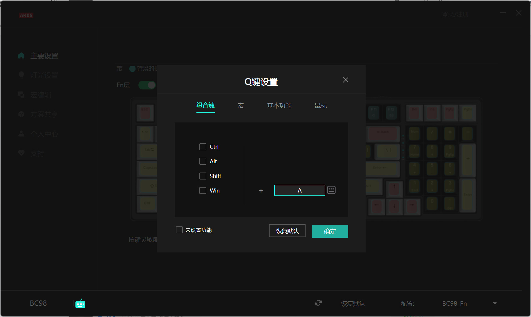 阿考斯的App功能也是非常详细,可以对键盘进行丰富的设置,不仅可以支持键位映射,灯效修改,还可以进行宏编辑和方案共享,设置方案可以保存和与他人共享。