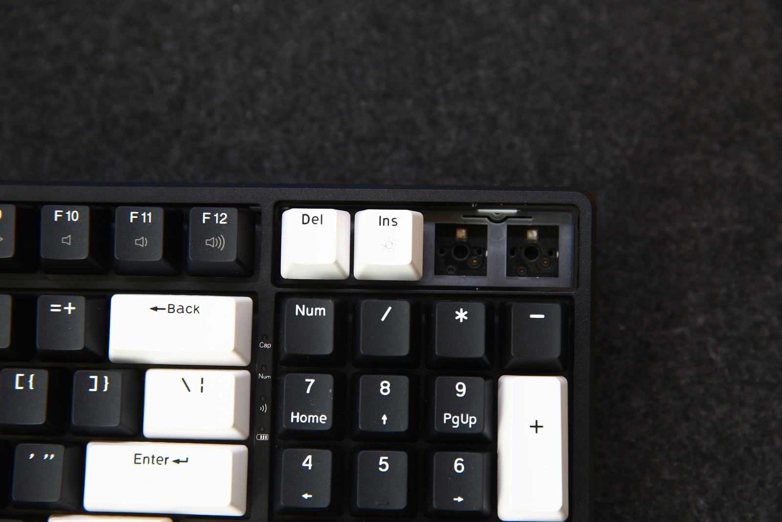现在揭秘赠送PgUp和PgDn增补键帽的原因,98配列的键盘是有注册专利的,为了规避版权风险,阿考斯BC98出厂时按键是96个,买家收到产品后可以去掉Logo盖子,再装上两颗增补键,至此形成98完成配列。