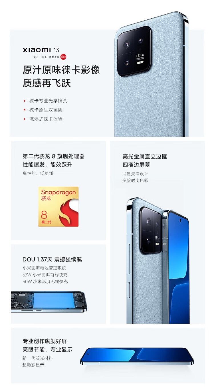 ●小米13采用第二代骁龙8移动平台,采用全新架构,添加全新的Cortex-A715,1X超级核心,4X性能核心,3X能效核心,基于全新台积电 4nm制程工艺,晶体管密度提升20%,全新Adreno GPU,并采用全新LPDDR5X内存,峰值频率达到8533Mbps,全系标配的UFS4.0闪存,可以实现3.5GB/S的顺序读取速度和26GB/s的顺序写入速度,并支持FB0存储焕新技术,使闪存常用常新;