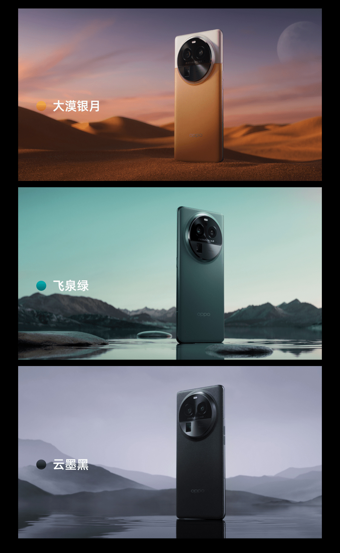 OPPO Find X6 Pro拥有三种独具特色的配色方案,分别是大漠银月、云墨黑和飞泉绿。除此之外,为了满足用户的不同需求,该款手机还提供了三种不同版本的选择,即12+256GB、16GB+256GB和16GB+512GB,可以根据个人存储需求来自由的选择,无论是采用玻璃版还是素皮版,这款手机都保持着相对轻薄的外表设计,重量在218g左右,厚度则在9.1mm到9.5mm之间。