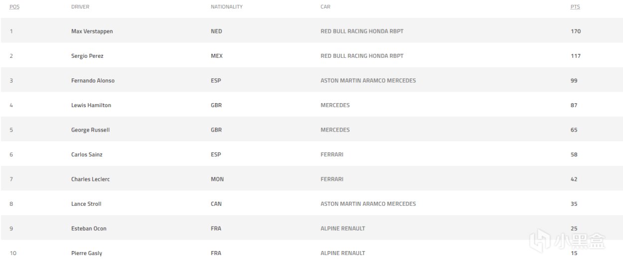 本赛季红牛包揽了全部了七个分站赛冠军,维斯塔潘五冠,佩雷兹两冠,汉密尔顿本场进一步缩小与阿隆索的差距,并当选本场最佳车手!塞恩斯也进一步拉开了与队友勒克莱尔的差距,周冠宇第九则是再度收获两个宝贵的积分,目前领先角田排在第15位!