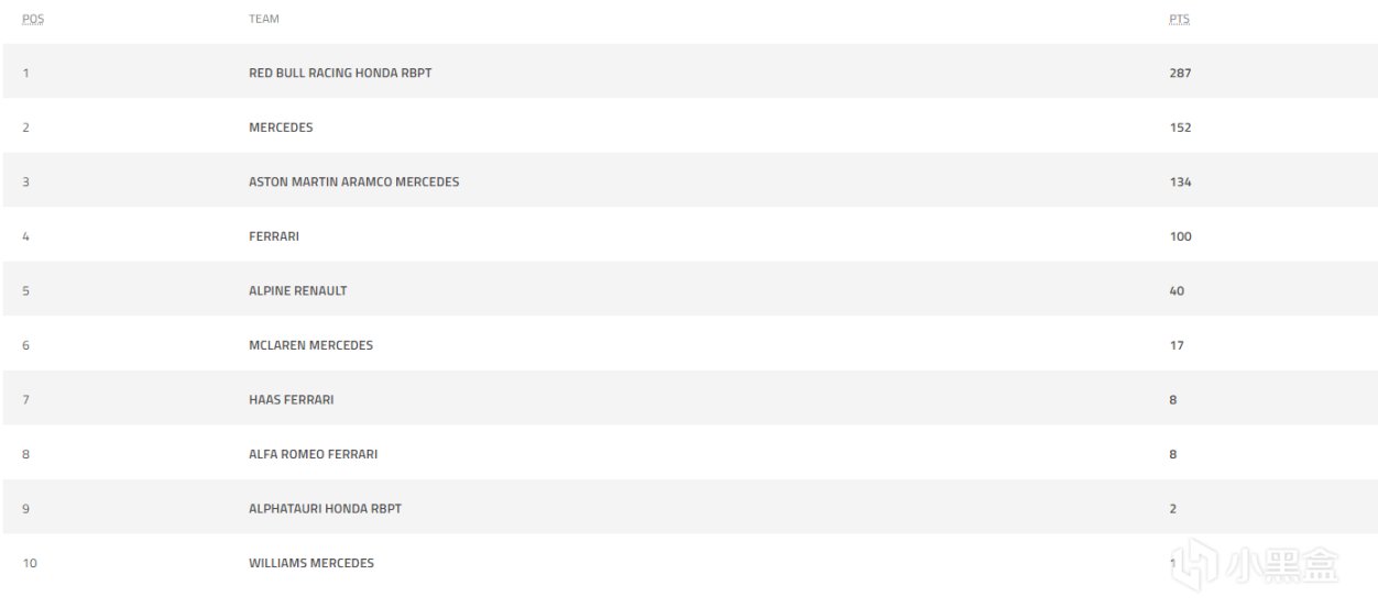 车队积分榜上,红牛遥遥领先,梅奔双领奖台反超马丁车队,阿罗则依靠周冠宇的2分,追平了哈斯,迈凯伦则成为本场最大输家!