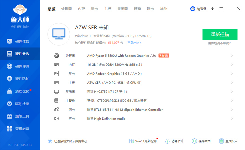 经过使用娱乐大师的跑分测试,这台设备得分高达664007分,远超过65%的用户,可以说,它的处理器和显卡、内存及固态硬盘的性能表现相当突出。不仅可以满足我们日常上网、办公、观看影音等基本需求,还可以轻松应对一些游戏等高强度操作,可以满足日常工作、娱乐的需求。