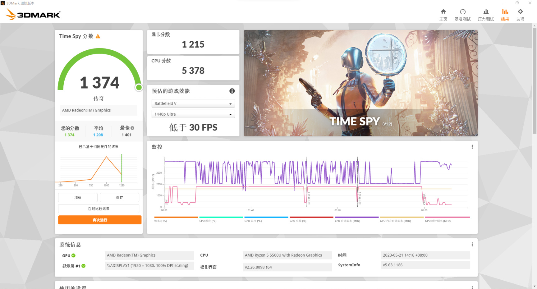 3DMark的TimeSpy主要考验显卡的2K DX12性能。据测试结果,总分为1374,其中显卡得分为1215,CPU得分为5378。值得一提的是,零刻SER5 R5-5500U的内置核显在这个测试中表现相当不错。