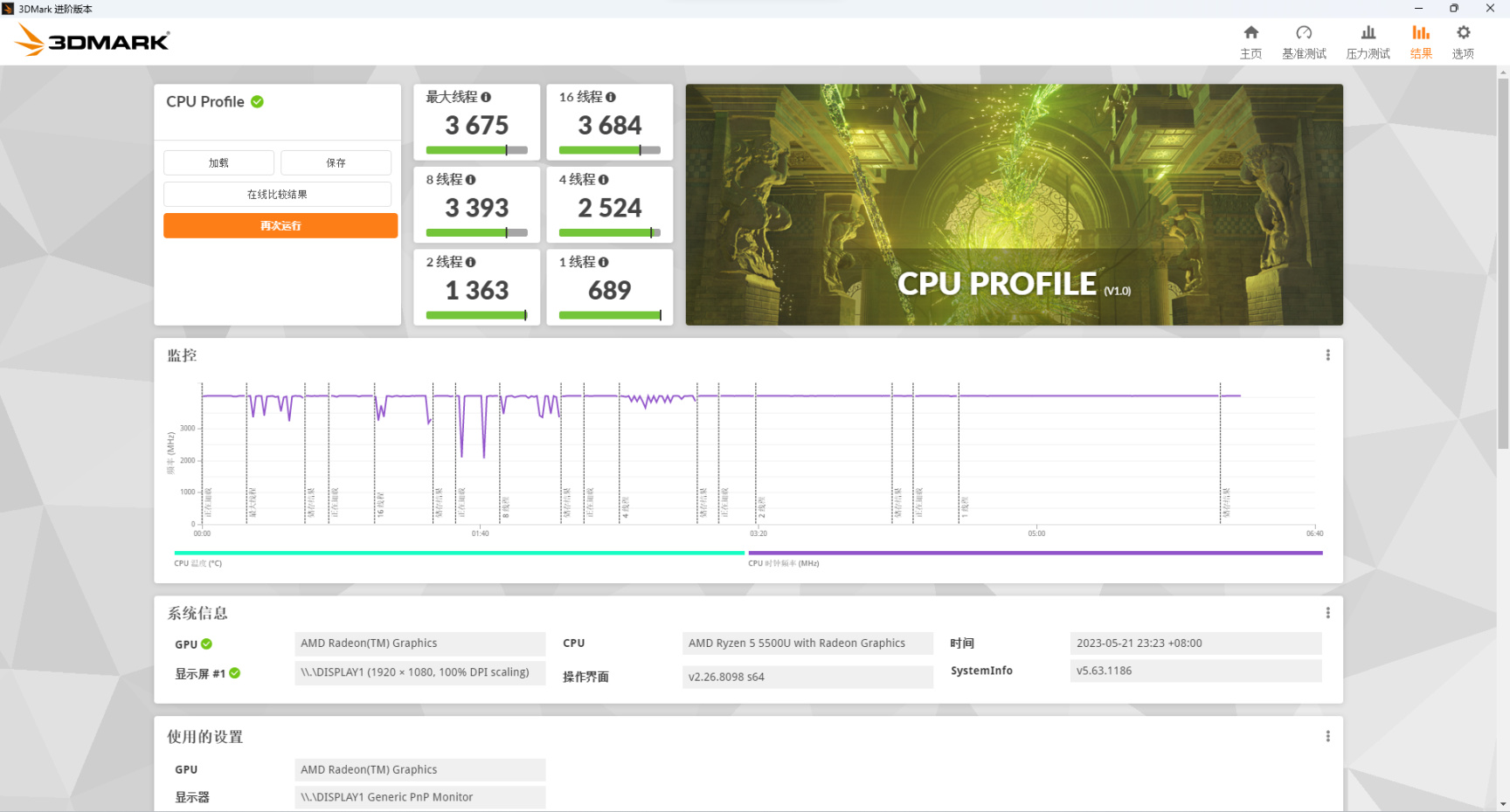 零刻SER5 R5-5500U在CPU Profile测试中的表现相当出色,它在不同线程下的性能都十分优秀,在最大线程数时,其得分达到了3675,而在16个线程时则更进一步地提升到了3684,即使是在8个线程和4个线程运行时,其得分也分别达到了3393和2524,而在2个线程时,其得分也有1363,在单线程模式下还能获得689的得分。这款处理器的多线程性能非常强劲,并且能够满足稳定运行的多线程需求。