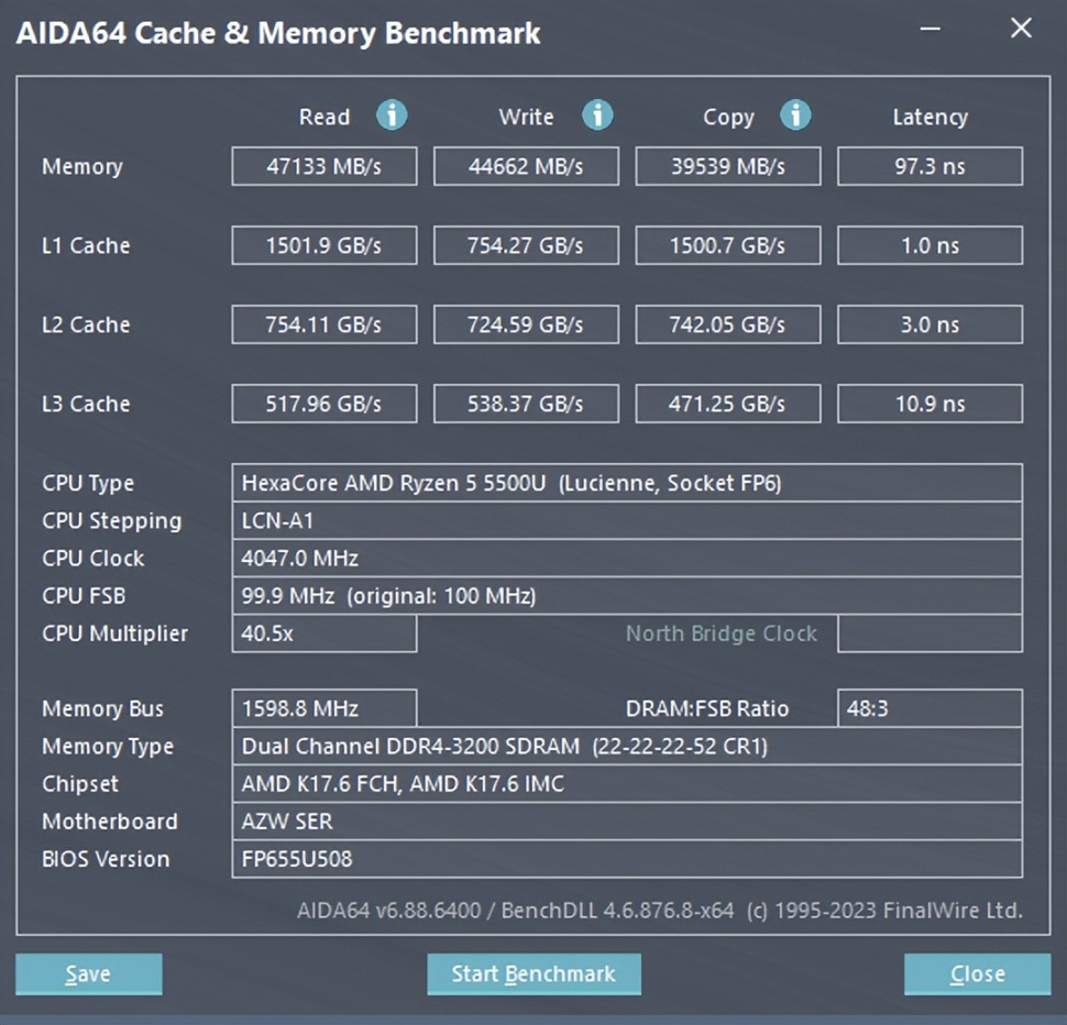 AIDA64测试显示搭载这两条的8GBx2内存双通道(DDR4 3200Mhz)的读取速度为47133 MB/s,写入速度为44662 MB/s,复制速度为39539 MB/s,延迟为97.3ns,整体表现还可以,延迟稍微高了些。