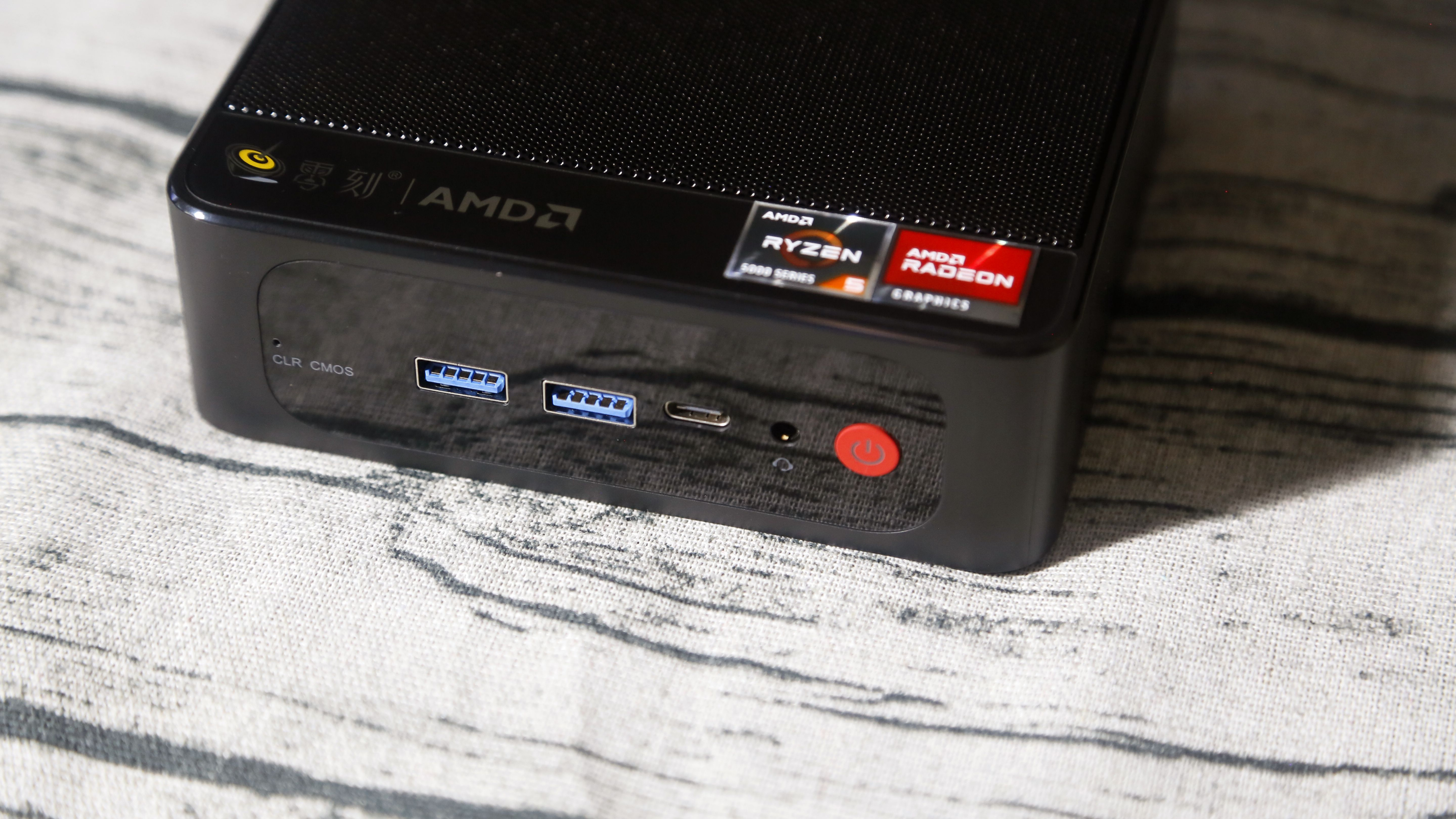 作为一款日常使用的 MiniPC 零刻 SER5 R5-5500U在接口方面表现非常出色,机器正前方从左往右分别是:一个cmos清除按钮、两个USB 3.2 GEN 2接口、一个Type-C接口(仅支持视频及数据输出,不支持PD快充)、一个3.5mm二合一耳机孔,还有一个带LED灯的电源按键。