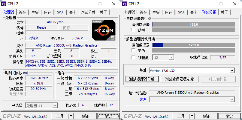 使用 CPU-Z 软件测试,我们可以看到AMD Ryzen 5 5500U处理器的详细信息。这款处理器具有6核心12线程,TDP功耗是15W,集成核显为AMD Radeon RX Vega 7 ,具有Zen 2的 L1 缓存,基本/最大CPU频率为2.10 - 4.00 GHz,。在测试环节,AMD Ryzen 5 5500U处理器的单核跑分为 158.6,多核跑分为 1232.0,这样的性能表现对于如文字处理、视频播放、网页浏览等等,可以满足大部分用户的需求。