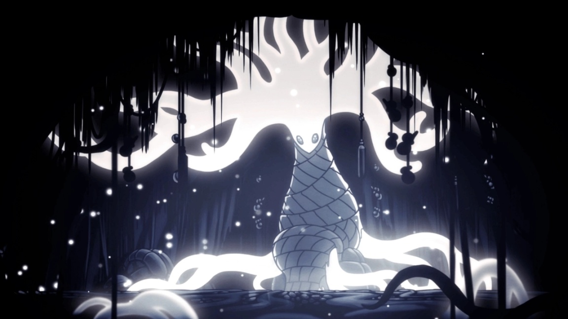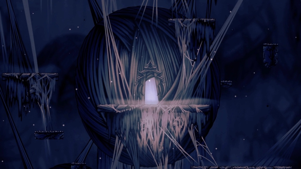 深渊的地图设计我真是太喜欢了,下落的途中是一个个大小各异的平台散落悬浮,而后来到谷底,往右边你可以取得一个关键的能力锁黑冲,这里有着与你类似的同伴。往左的风景同样绚丽,黑吼在此处取得。而在取得主线剧情所需的虚空之心后,你便不能用sl返回椅子,你必须跳上去,这个时候一个个黑影与你同行,大黄蜂也在站台上等你。