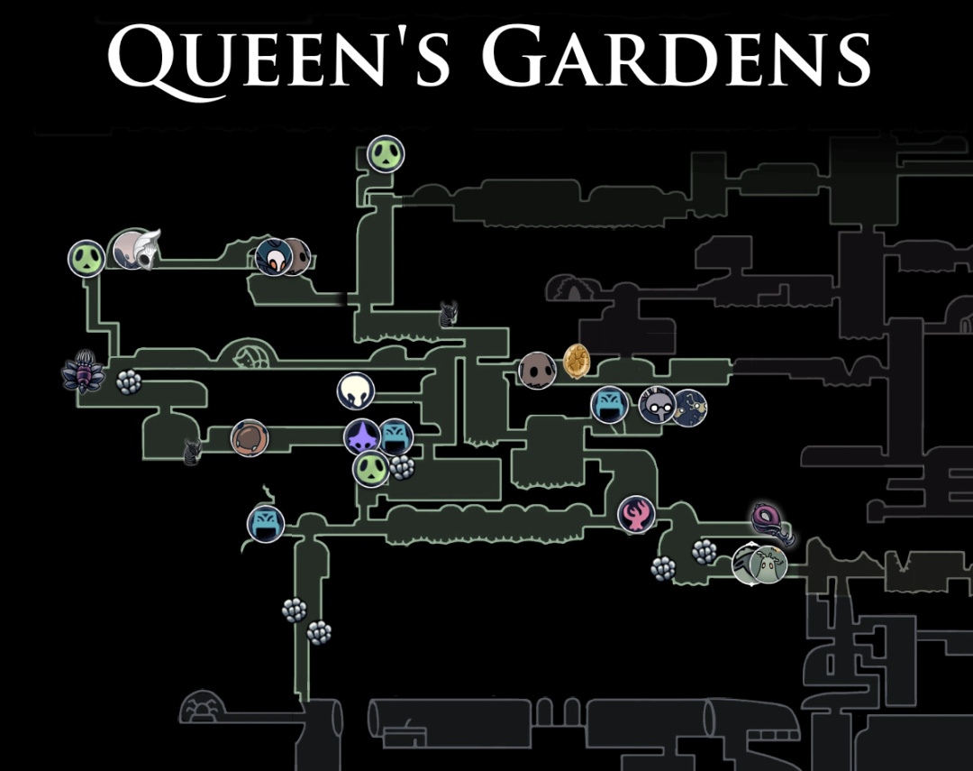 王后花园位于整个地图的左边,与深邃巢穴,苍绿之径,雾之峡谷,真菌荒地相连。银河城游戏偏后期的图都显得平台和陷阱较多,王后花园的平台则是站上去就会倾斜的危险之地,而下面可能是布满的荆棘。但是已经走到这里的玩家面对这些挑战应当是轻轻松松。如若你接受了安息之地某位女子的思念之花,那么这些荆棘可能就显得有些讨厌。和雾之峡谷一样,王后花园也有黑冲门,那是我们挑战叛徒领主的必经之路。