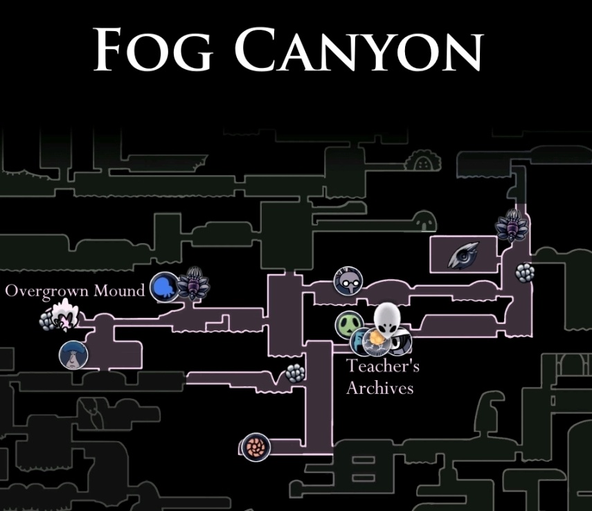 雾之峡谷与遗忘十字路,真菌荒地,苍绿之径,王后花园相连,初见时你可能很能想到温和的苍绿之径和真菌荒地中间竟然藏着这样一个充满危机的地图。作为银河城游戏的中后期图,一般需要你已经解锁了大部分能力,雾之峡谷也不例外,在这个满是酸液的地方,酸泳显得尤为重要。但是这种能力锁在雾之峡谷显得并不强制,制作者期待着玩家的无限可能。于是你会发现在遗忘十字路的隐藏通道,一个狭小的抓角,你抓住后可以靠超冲来到雾之峡谷而不需要酸泳,这也是之前的低完成度速通中的超冲线的必经之路。雾之峡谷有一道暗影之门,就连上天入地的地图师柯尼法都无法通过,这里需要玩家拥有黑冲,但是这条路线并不是主线的必经之路,然而它依旧值得玩家探索。