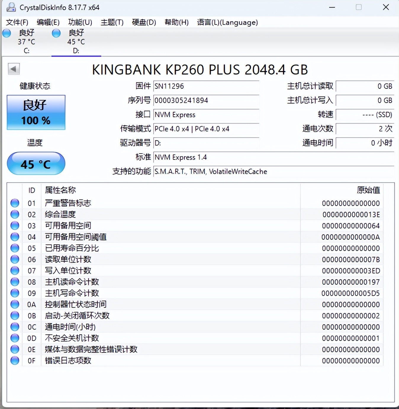 首次开机,我通过CrystalDiskInfo检测,可以识别KINGBANK KP260 PLUS 2048GB。状态栏显示新硬盘目前通电次数2、通电时间0小时,成色完美。室内环境28摄氏度的情况下,开机温度45摄氏度。