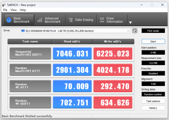 在TxBench测试中,这块2TB固态硬盘512K大文件读写速度为7046MB/s、6225.42MB/s,4K小文件随机读写速度70.09MB/s、292.47MB/s。不仅读取速度符合官方标称,写入速度也相当靠谱。