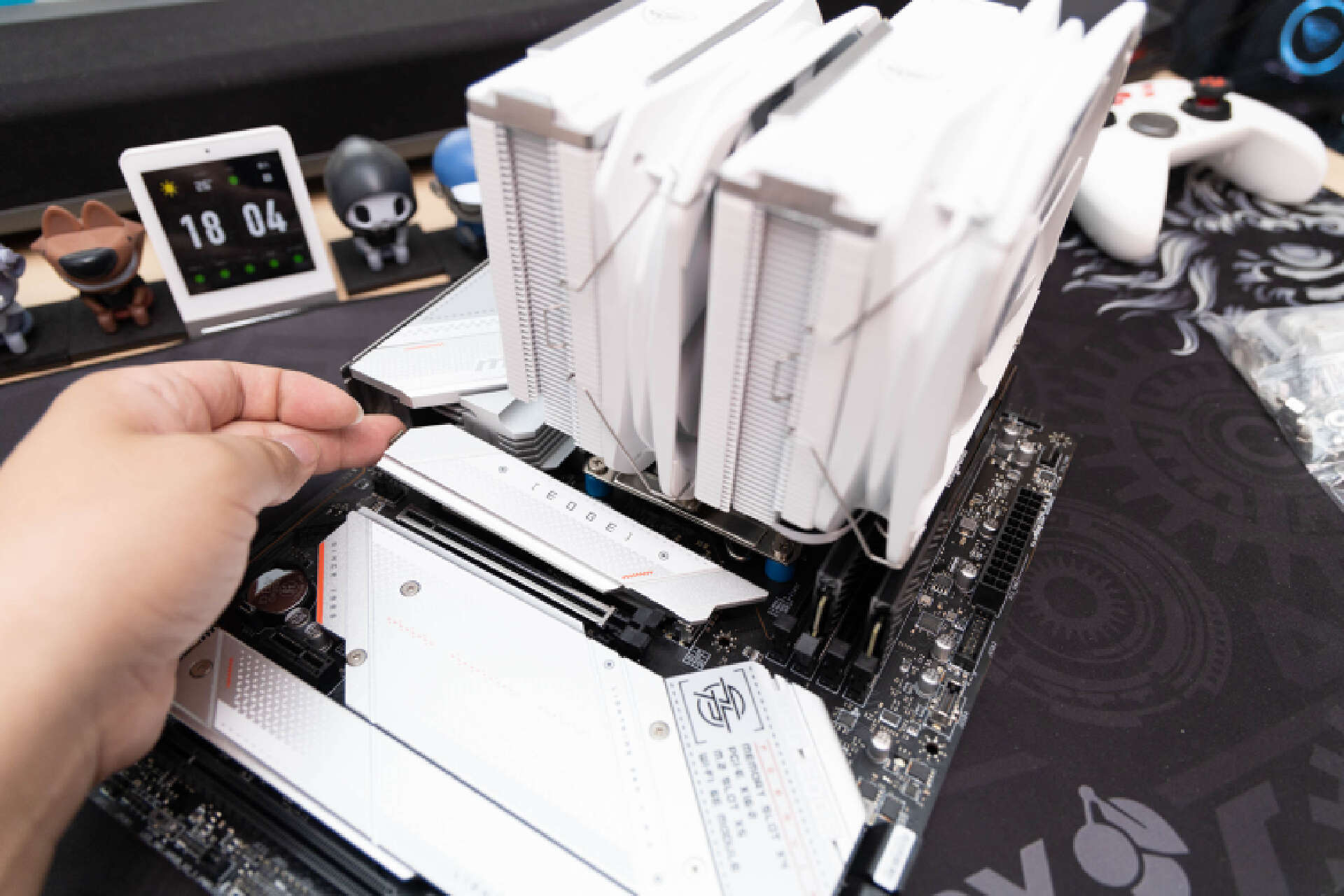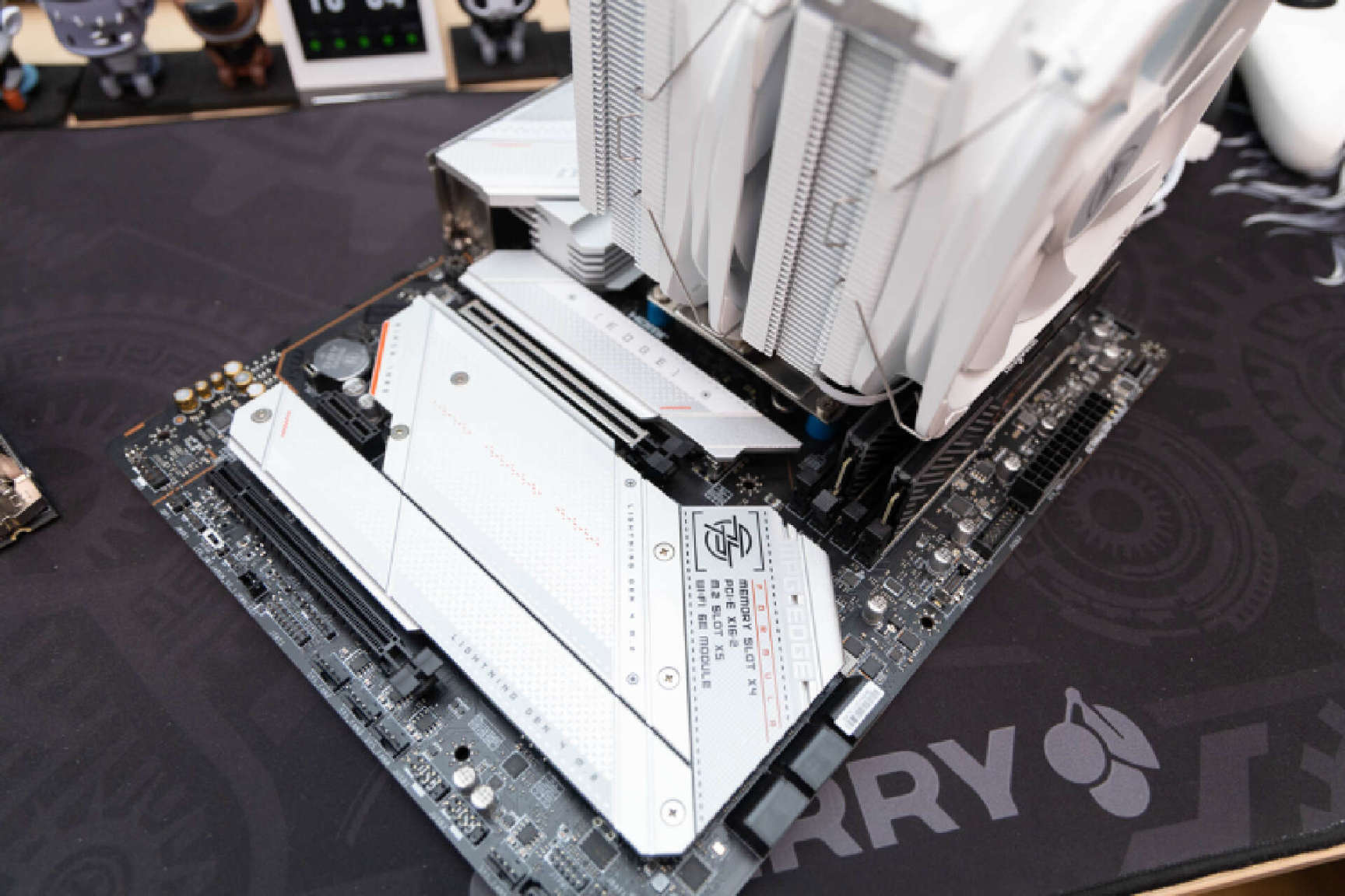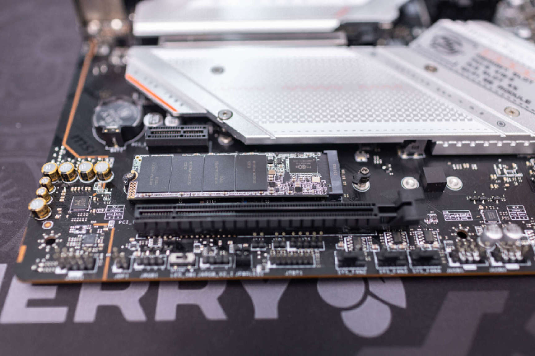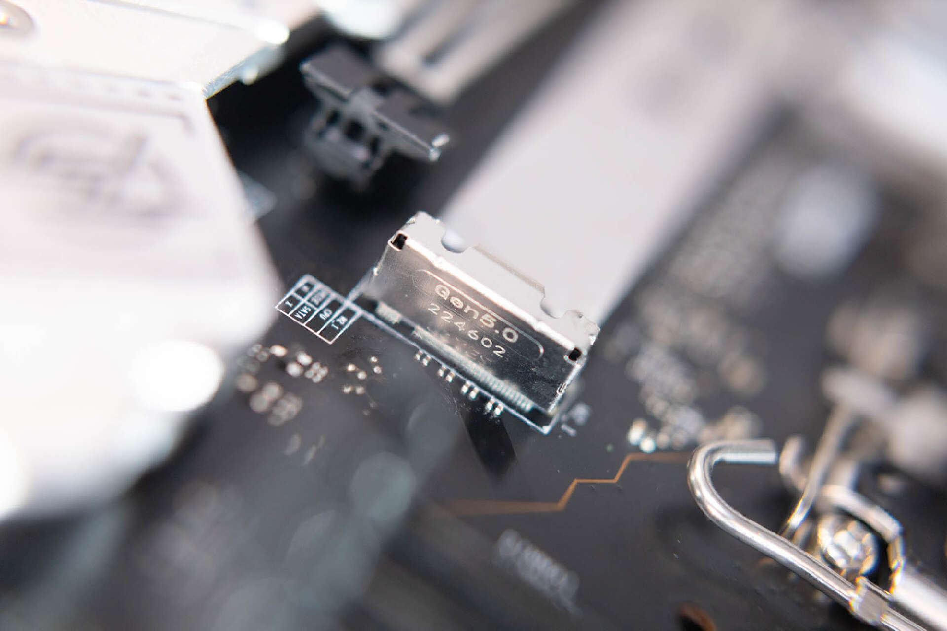 这块Z790 EDGE主板的装甲覆盖相当饱满,不仅在南桥位置可以看到全新设计的MPG标识和主板型号标识。还还配置了PCIe4.0*4和PCIe3.0,兼容性和扩展能力也非常强悍。可以看到这里主M.2硬盘插槽位置的散热装甲配置了免工具拆装设计,按压卡扣就能轻松取下,安装硬盘更加便利。