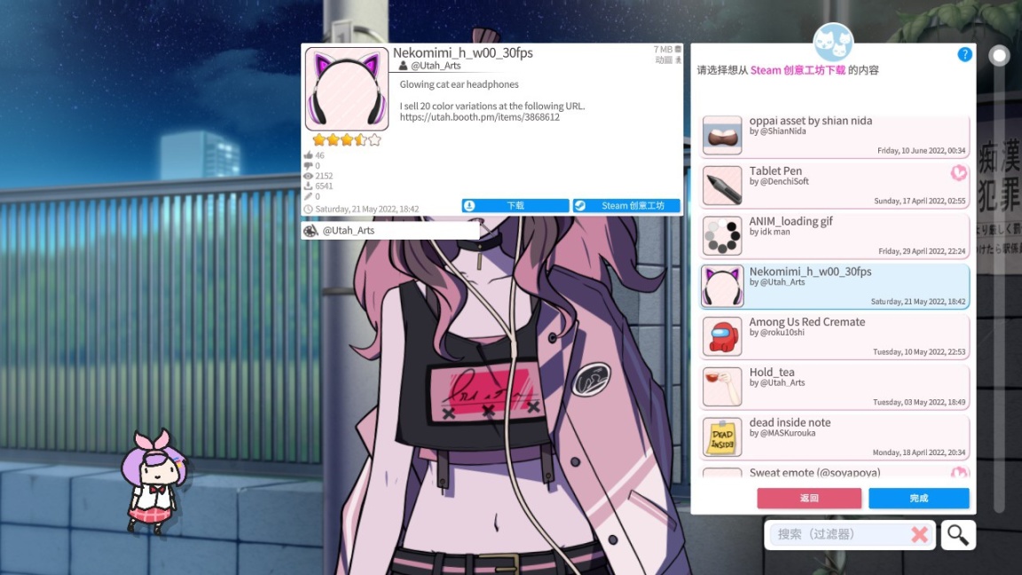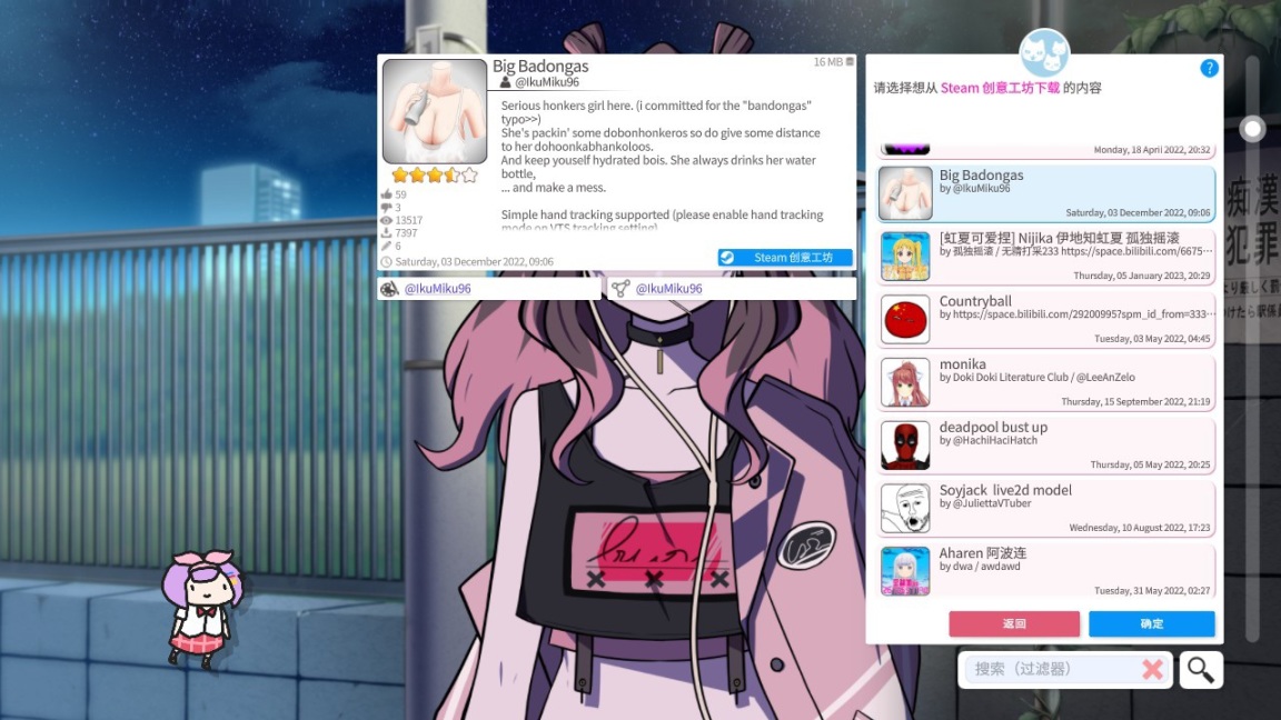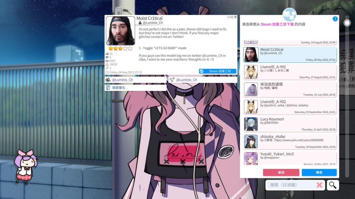 值得注意的是,如果直接在遊戲外創意工坊訂閱模型或組件,進入VTS後是不會顯示的。最方便的做法是先打開VTS,在左側找到設置右邊的印有steam標誌的按鈕,點擊後找到創意工坊選項,即可在這裏直接搜索並下載各種可愛或奇怪的模型與掛件。