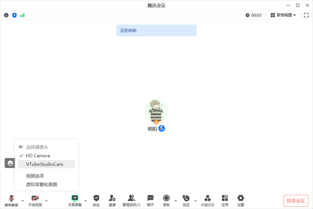 在一次更新後,我們不再需要利用obs將模型畫面推流到其他軟件。只需要在VTS中開啓激活虛擬攝像頭,即可在直播、騰訊會議、微信QQ的視頻通話中讓對方看到你的虛擬形象。