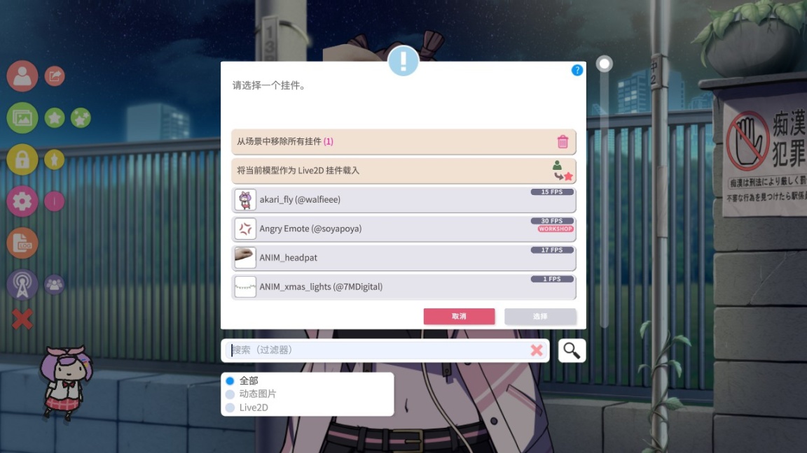 以上設置好後,退出設置界面,點擊左側第一個模型按鈕選擇該軟件自備的幾個模型,點擊第二個背景按鈕,選擇你喜歡的背景,在背景按鈕的右邊星形按鈕,點擊後可添加各種可愛的掛件。第三個按鈕爲鎖定模型,它能讓模型保持在你鎖定的位置,不隨你的身體搖晃而任意前後放大縮小。