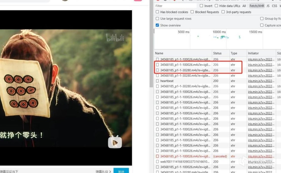 隨後按f12打開網頁源代碼,等它播放一段時間,直到資源列表會刷出類似下圖的含有“100026.m4s”和"30280.m4s"標識的網絡接口: