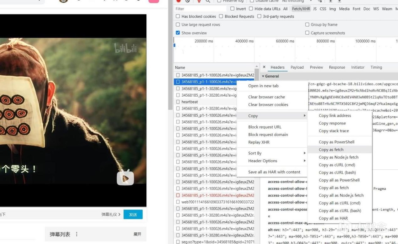 我們先下載視頻,右鍵任意一個標識有"100026.m4s"的接口,選擇copy -> copy as fetch: