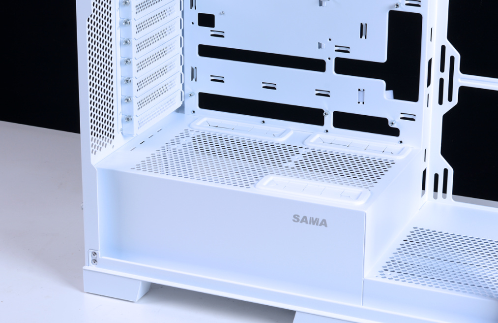 不分仓的海景房,那它还是海景房。电源仓上方除了充足的进气散热孔,还有个理线开孔,常规横装显卡走线,更美观。