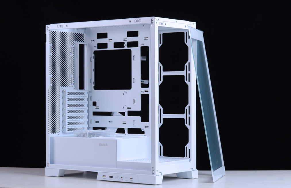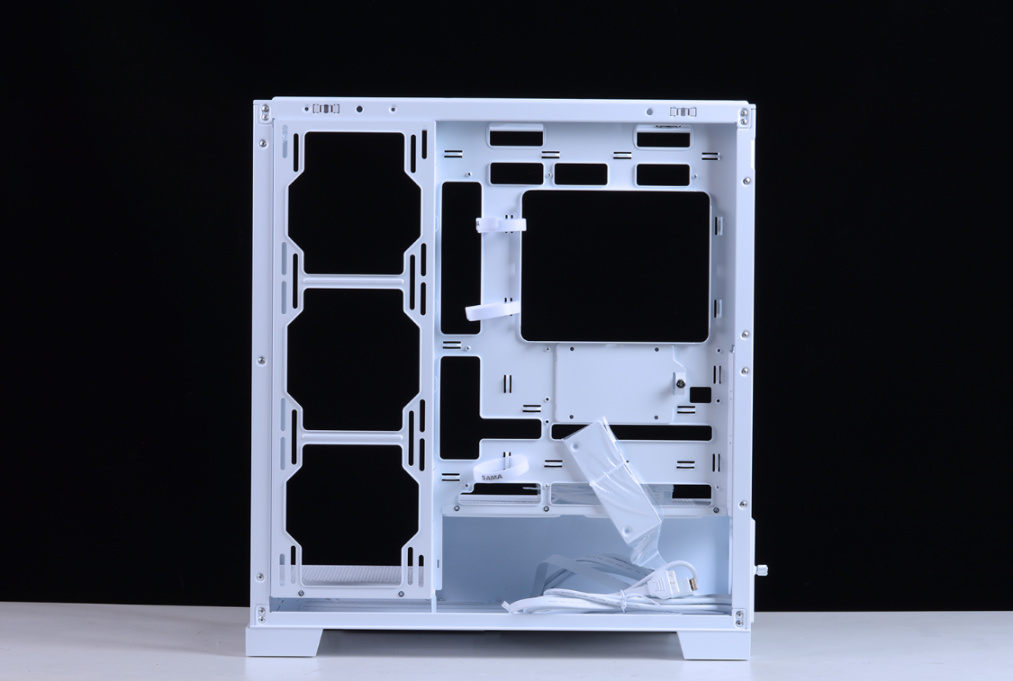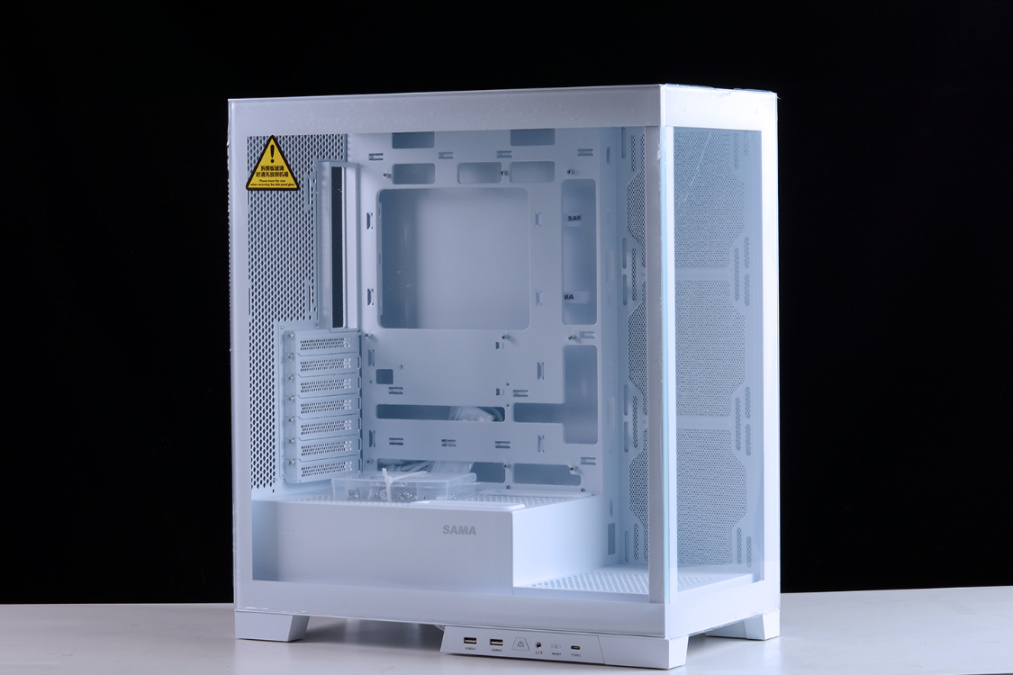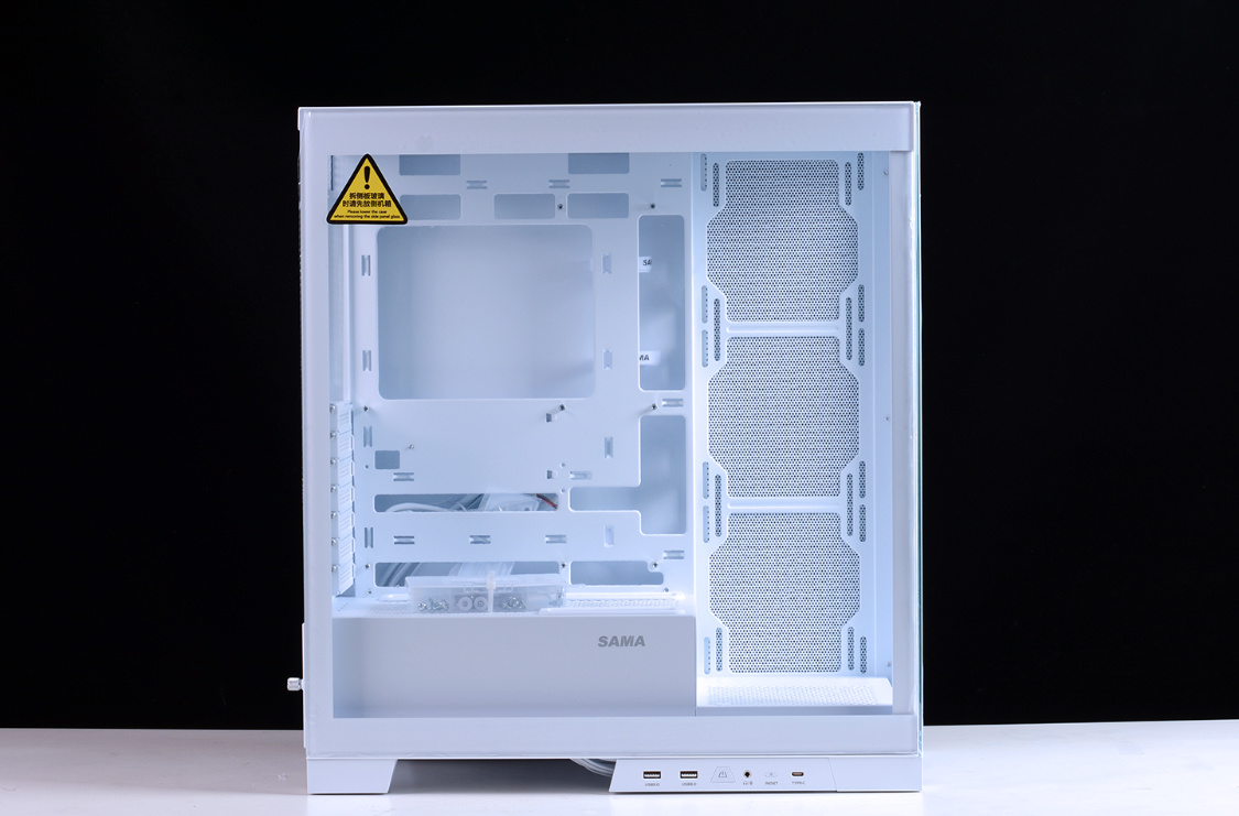 机箱整体采用快拆结构设计,面板、顶板、侧板均通过卡扣式结构固定。前+侧两面270°超白玻全透视野,加上可拆立柱设计,可以更好的展示内部硬件。