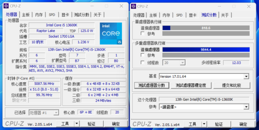 全默跑个CPU-Z,单核得分818.6分,多核得分9844.4分;