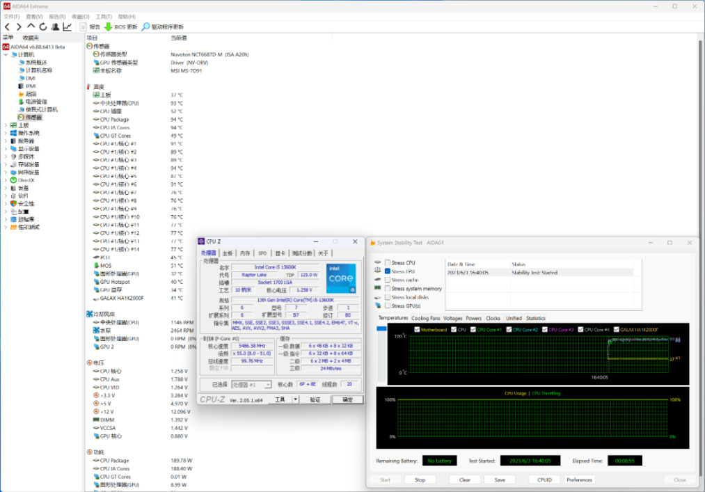 全核5.6G状态,CPU功耗190W左右,温度在93°左右。