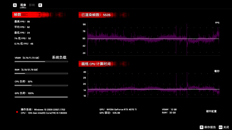 《看门狗·军团》基准测试,4K分辨率,画质最高、光追超高、DLSS为画质模式,游戏的平均帧率为62FPS。