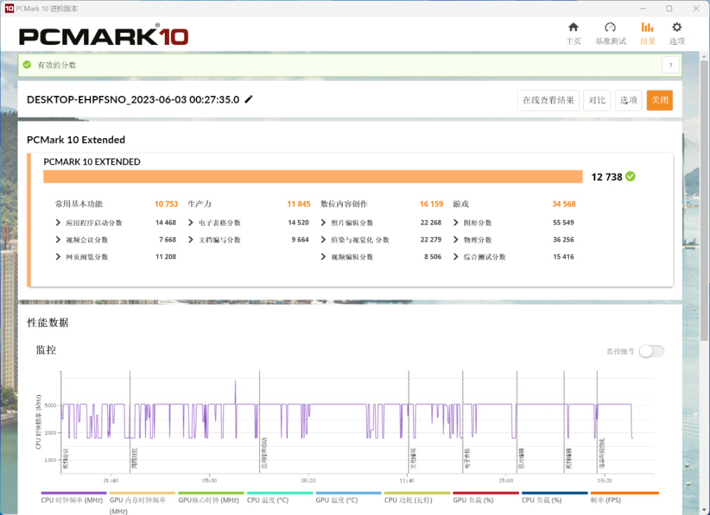 PC Mark Extended整机测试,整机得分12738分,常用基本功能测试得分10753分,生产力测试得分11845分,数位内容创作测试得分16159分,游戏得分34568分;