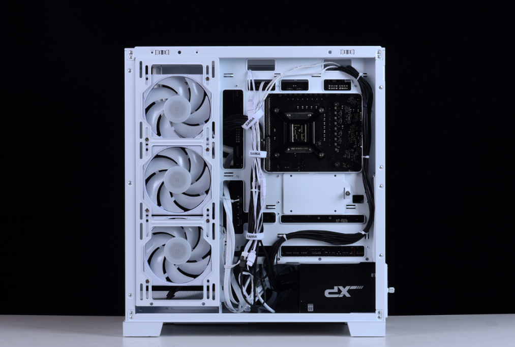装好散热和电源,顺便把侧面三把风扇翻个面。(颜值跟散热二者不可兼得,除非你花高价买反页扇)