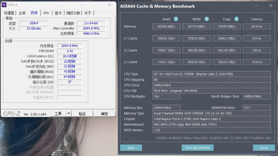 拉个4200MHz,锁G1,读取写入复制都有小幅上升,延时也降低到了62ns;