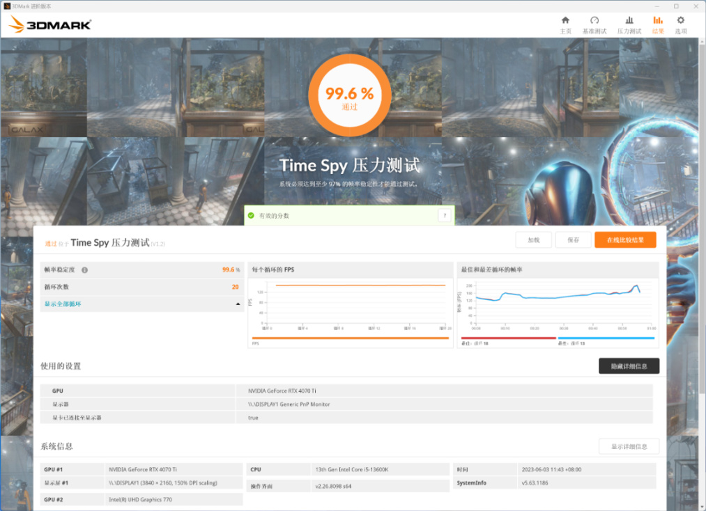 3D Mark跑个显卡压力测试,通过率99.6%;