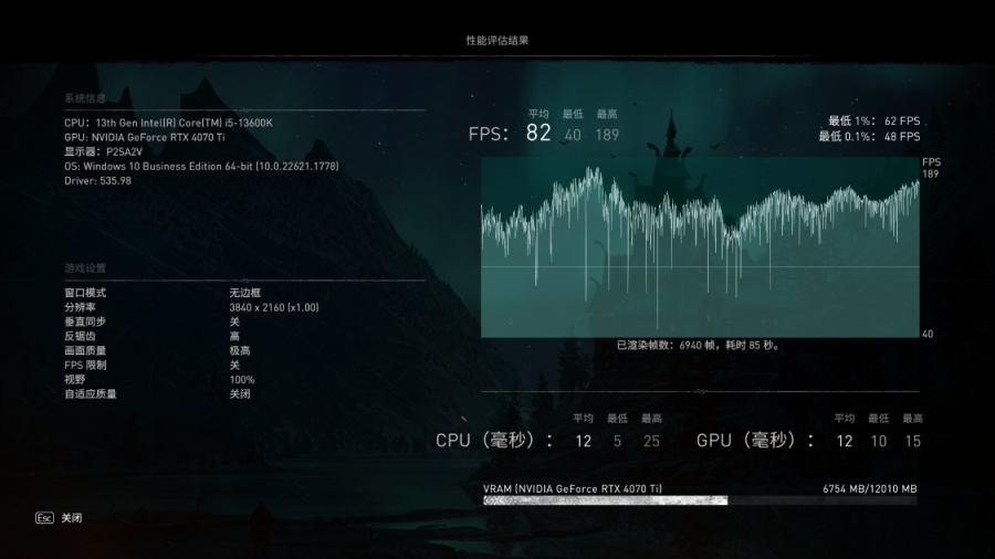 《刺客信条·英灵殿》,4K分辨率,极高画质,游戏平均帧率82FPS