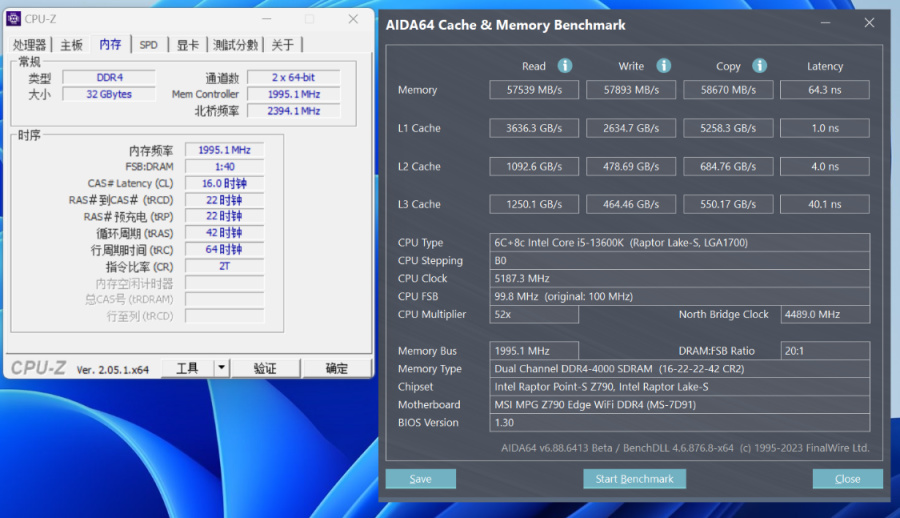 XMP状态,内存读写测试,读取速度为57539MB/s,写入速度为57893 MB/s,复制速度为58670 MB/s,延时为64.3ns;