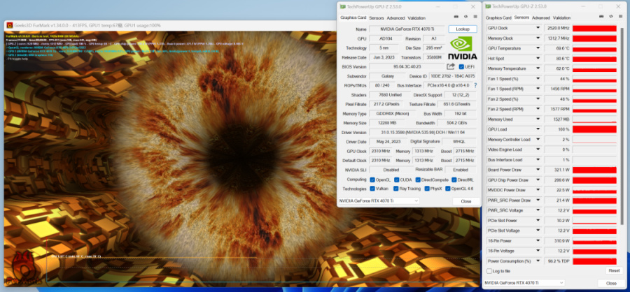 再烤个显卡,功耗310W,风扇不到半速,显卡温度最高在69.6°开始稳定下来