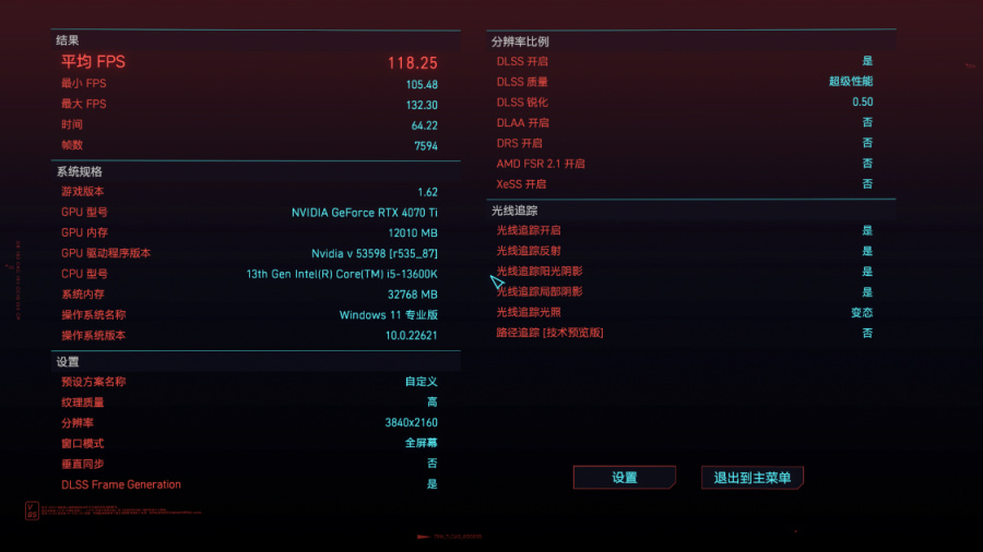 《赛博朋克2077》,画质超级,光追设为变态档位,4K分辨率下开启DLSS 3.0后,游戏实际帧率约为118.25FPS左右;