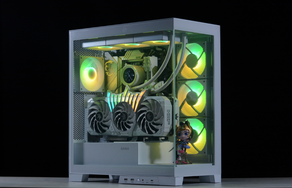 满大街都是海景房,但是真的好看吖!选定主题之后,无外乎就是在一众品牌中选出自己最心仪的那一款。朋友自个儿一眼相中的,先马大境界白色海景房机箱。机箱三围461mm*235mm*505mm,主体框架采用SPCC钢材质,结构稳定,搭配前+侧两面钢化玻璃面板,直接将质感拉满。
