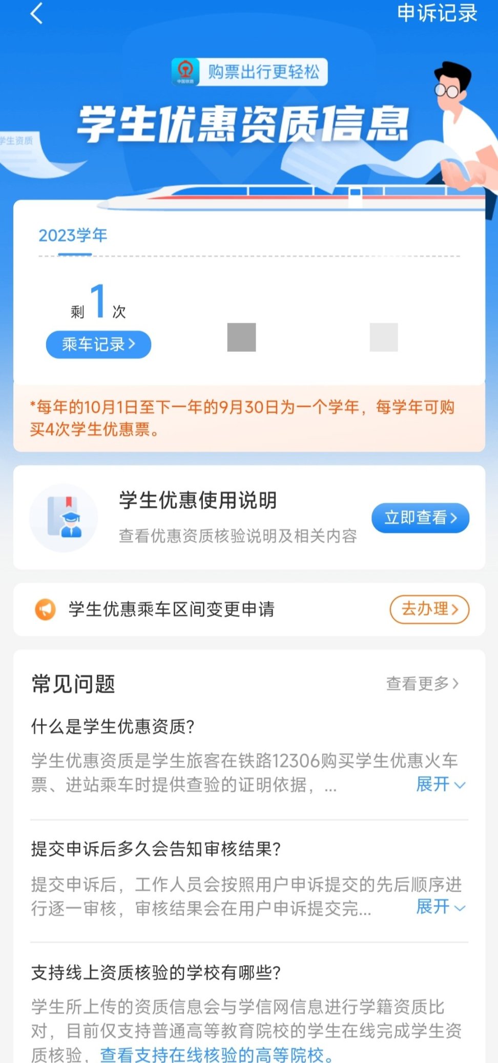 辦理學生票優惠資質覈驗後,不僅在網上購買學生票後,可直接刷身份證進站,省去了每學年去櫃檯覈驗的時間,還能更改優惠區間,享受更大的福利優惠。只不過大家一定要在購票前,檢查剩餘優惠次數,以免次數不足無法進站。
