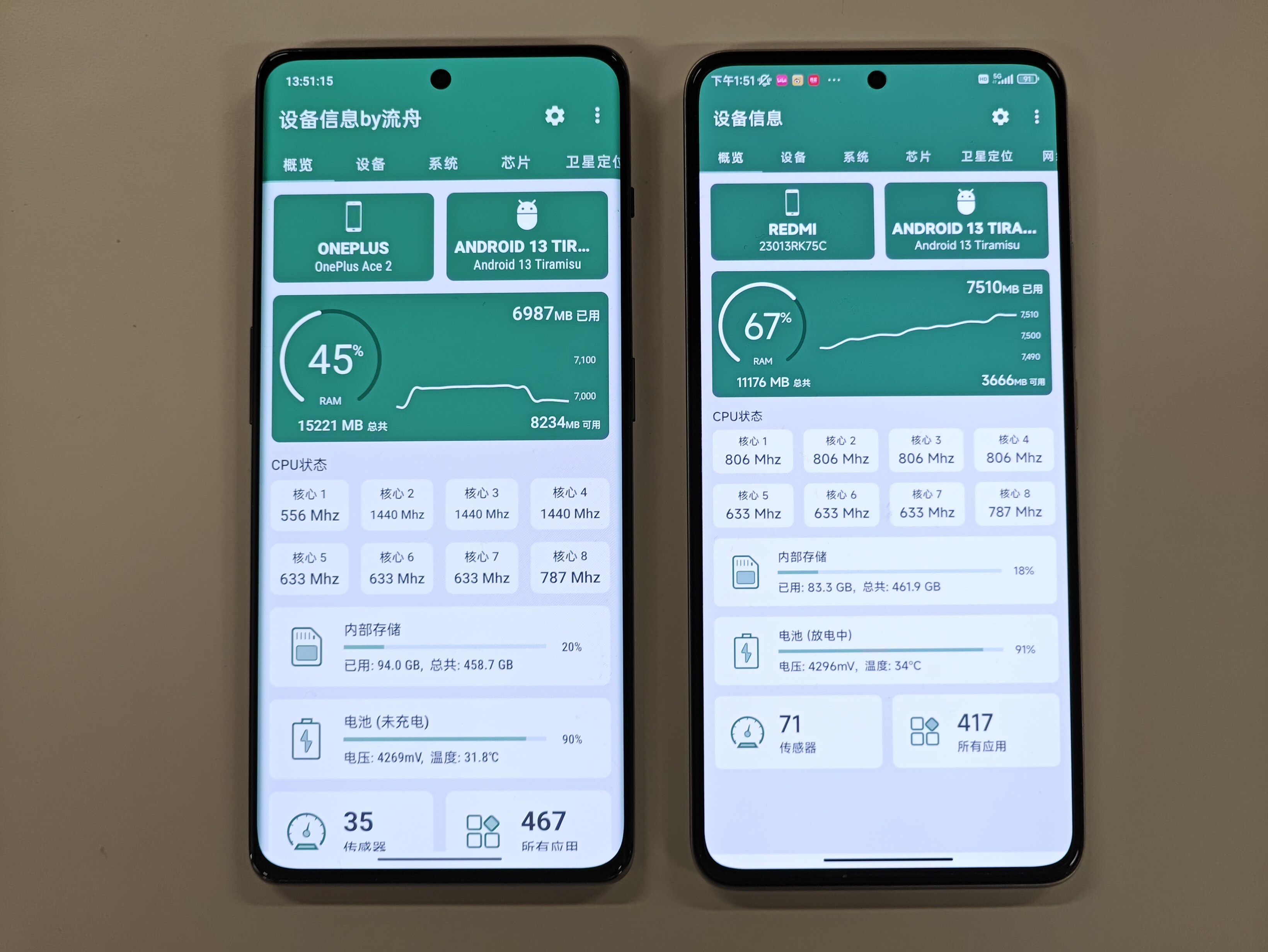 正是因为如此,骁龙8+给国产厂商在两三千元价位段手机的发力提供了强而有力的支持,一加 Ace 2和红米K60同样搭载了手机处理器骁龙8+,一个满血版,一个降频版,它们的表现却大为不同。一加 Ace 2拥有LPDDR5X内存、IMX890大底主摄和100W超级闪充等强大功能,而K60则配备5500mAh电池和2K分辨率屏幕等独特优势,这两款手机的各自特点都十分显著,它们各自都在不同方面取得了新的高度,那么,我们一起来看看它们的表现到底如何吧!