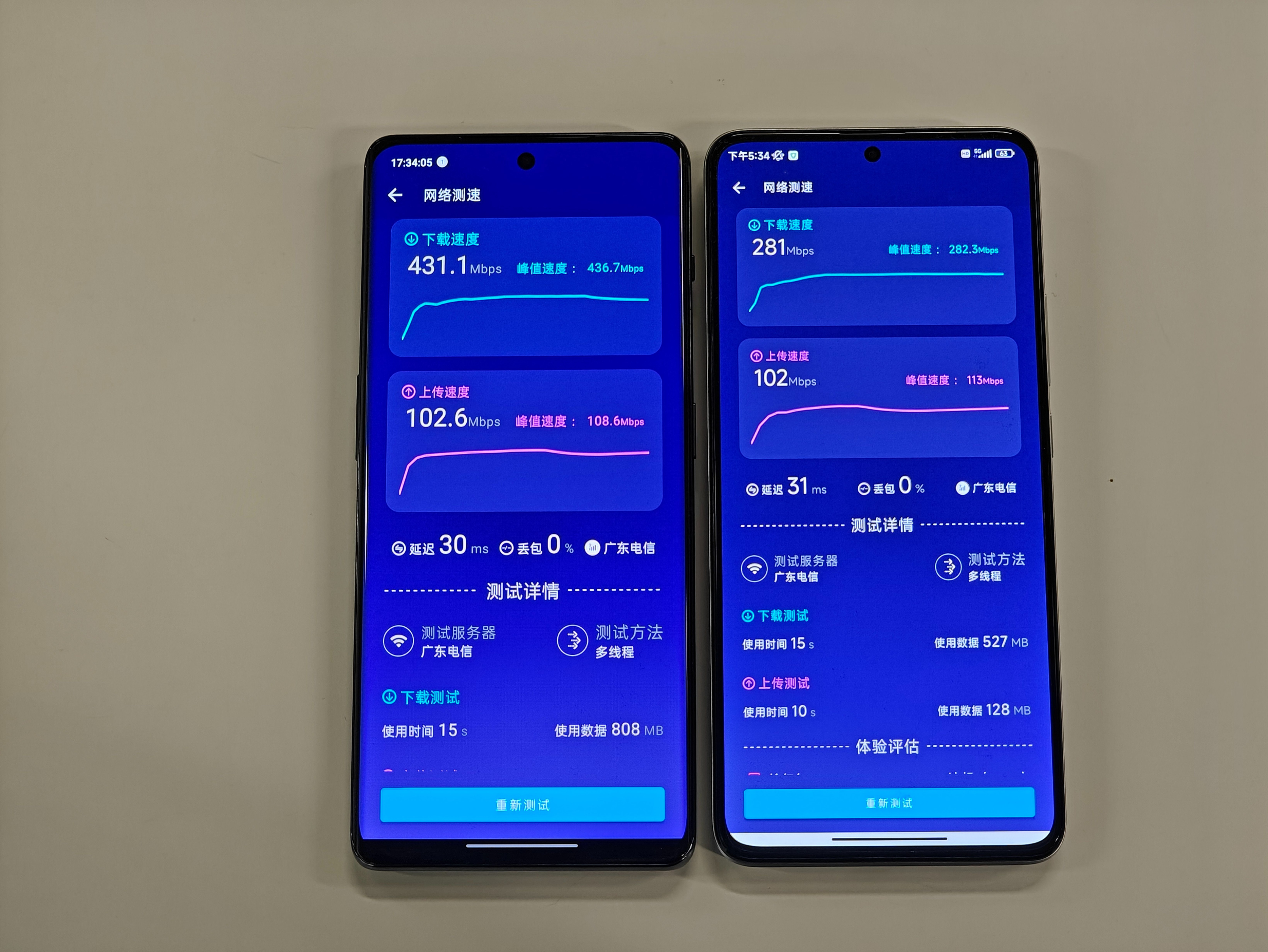 网络数据表现实测,上传数据二者几乎相同,但下载速度上,一加ace2为431MB,红米K60为281MB,都是中国电信5G网络。