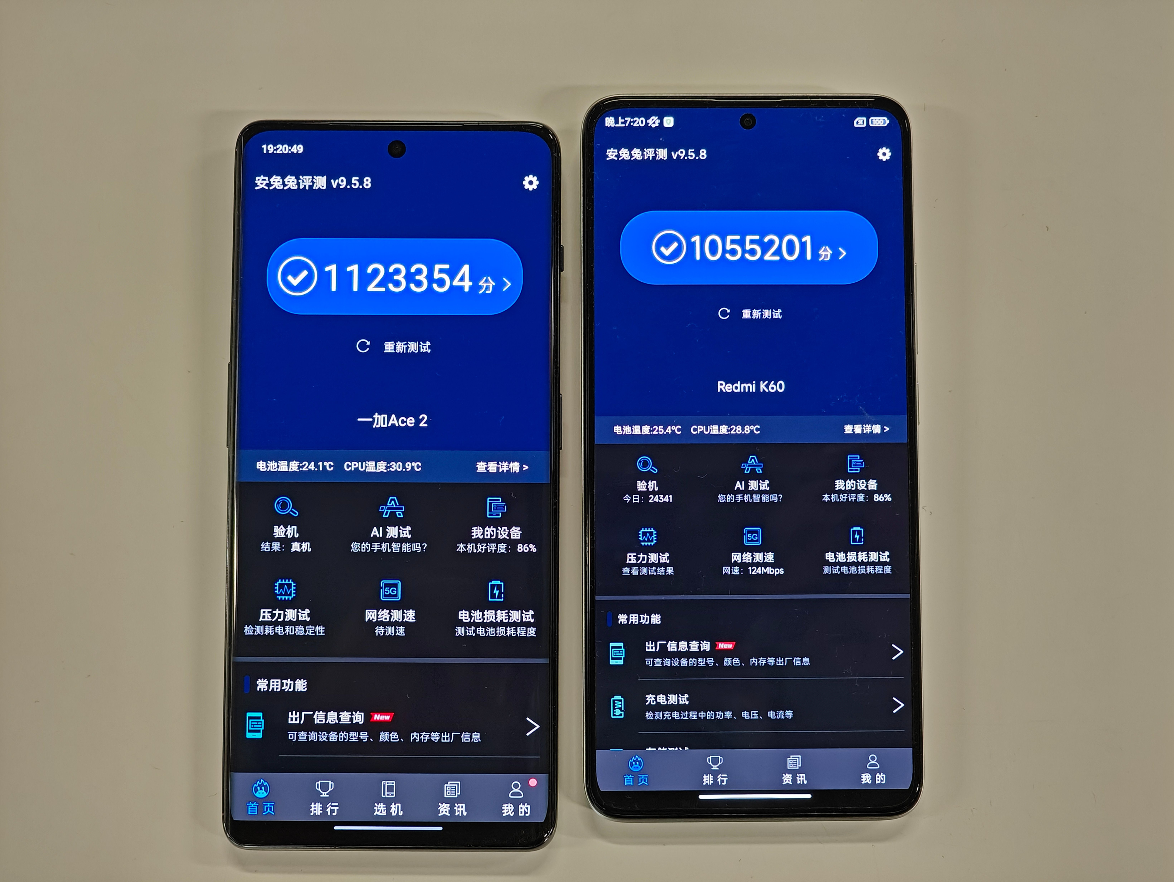 在安兔兔跑分中,一加 Ace 2总得分为112万分,红米K60总得分105万分。这主要得益于其满血版骁龙8+处理器与降频版相比的优势,以及一加 Ace 2所采用的LPDDR5X内存的性能上得到明显的体现。