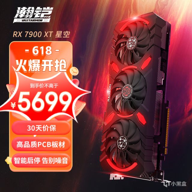 实在挤不出预算就考虑瀚铠RX 7900XT星空吧,Boost频率设定为2394MHz稍低点,整体设计朴素一些,灯光设计是多彩非ARGB,六镀镍热管+三风扇用料均衡,参考售价5699元,当省几百可以买一个1TB SSD。