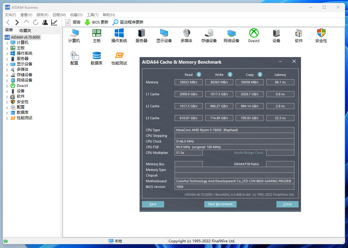 七彩虹B650巡洋艦讀取速度爲58932MB/s / 華碩B760老版本BIOS評分爲59092MB/s