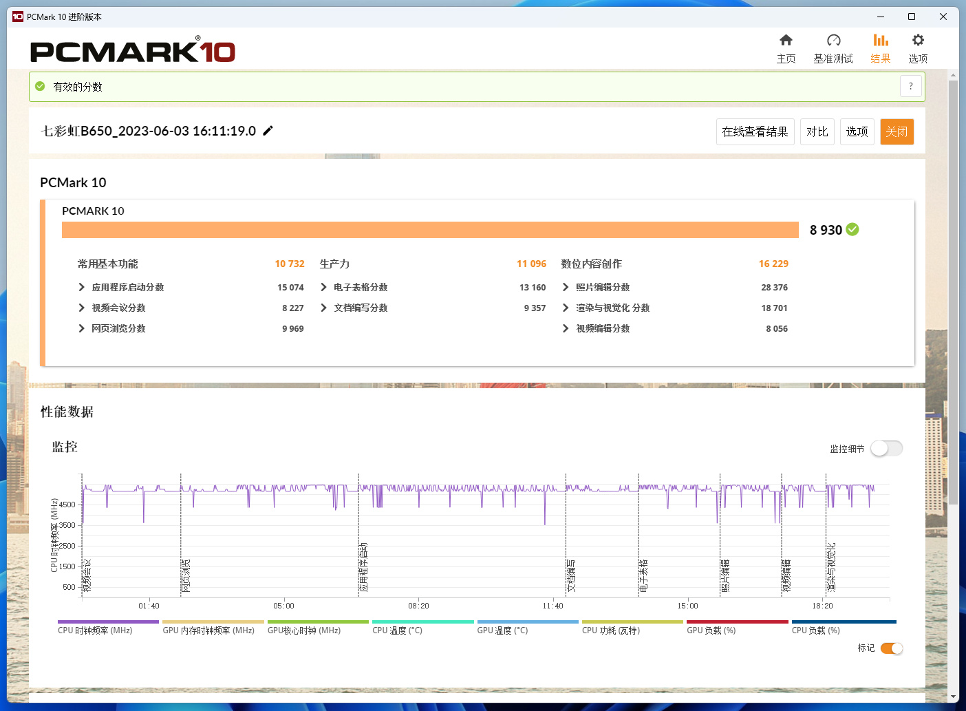 PCMark10主要考覈的是辦公場景的整機性能表現,測試結果如下圖所示: