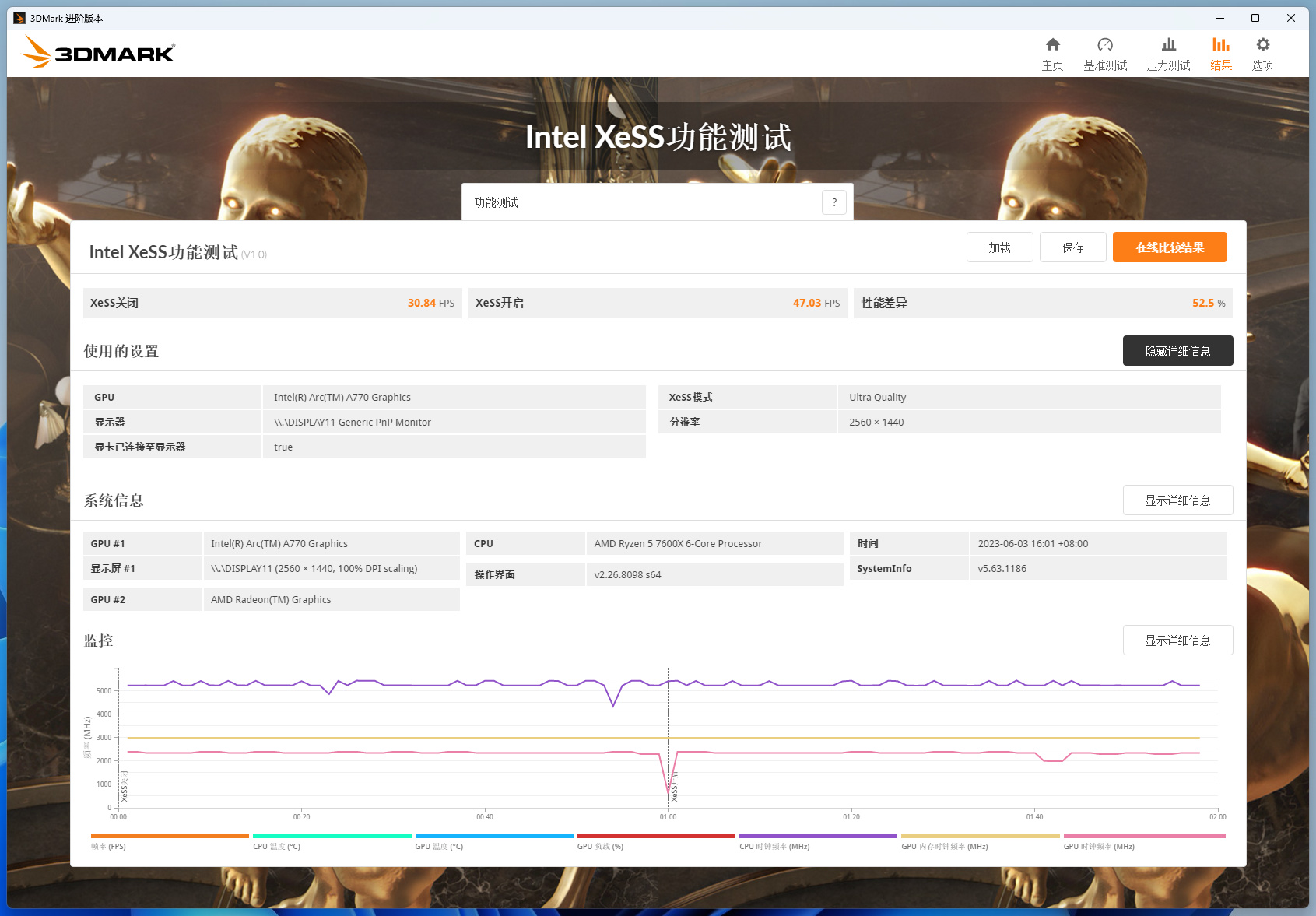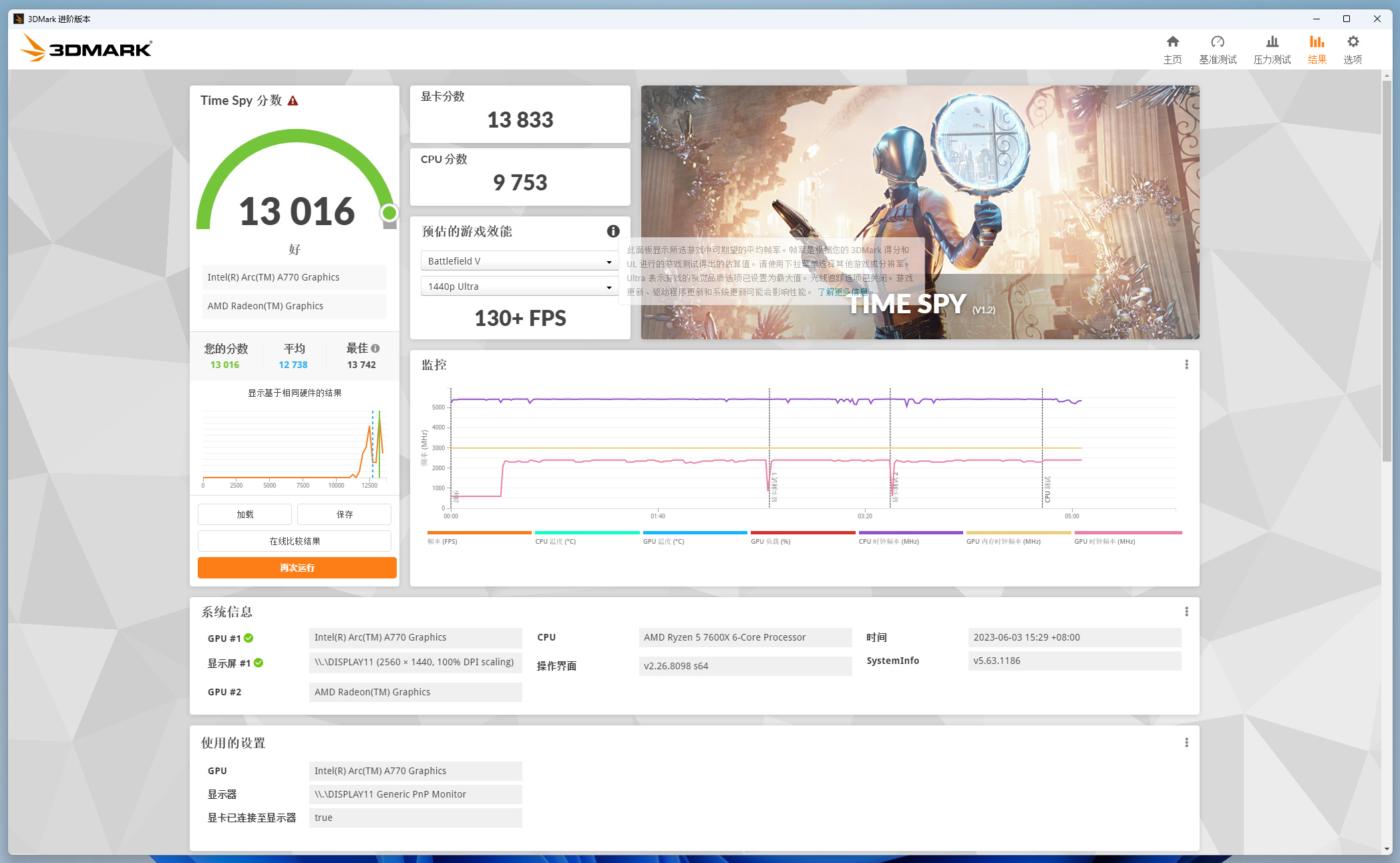 由於之前華碩那組數據使用的是Intel A770獨顯,本次就繼續用作測試,使用3DMark中針對DX12的TimeSpy測試,默認配置的測試結果如下圖所示: