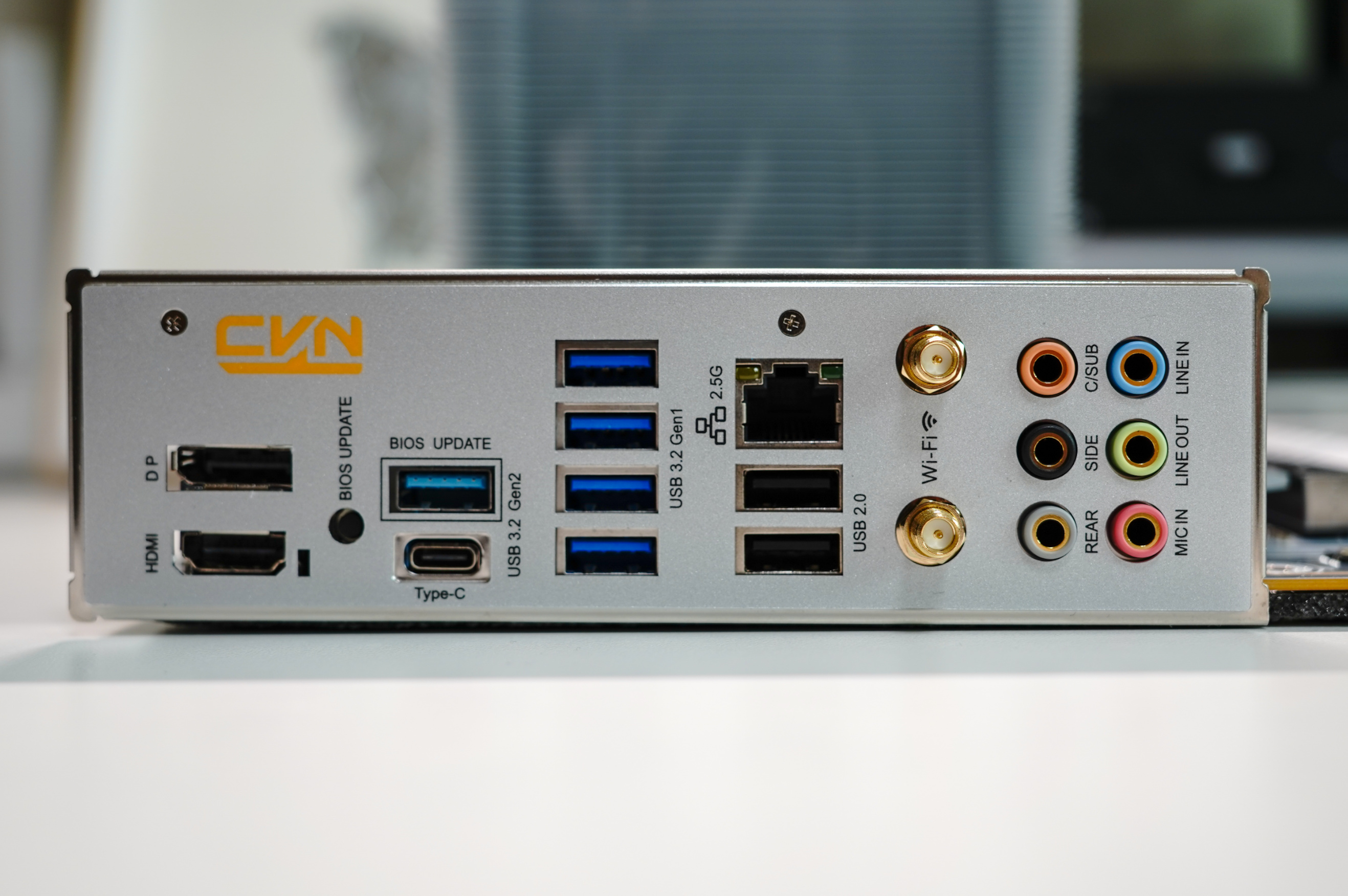 視頻接口包含HDMI接口*1、DP接口*1,網口包含2.5Gbps電口*1和兩個WiFi增益接口,音頻接口則有六個,另外還有一個無CPU更新BIOS的獨立按鍵。