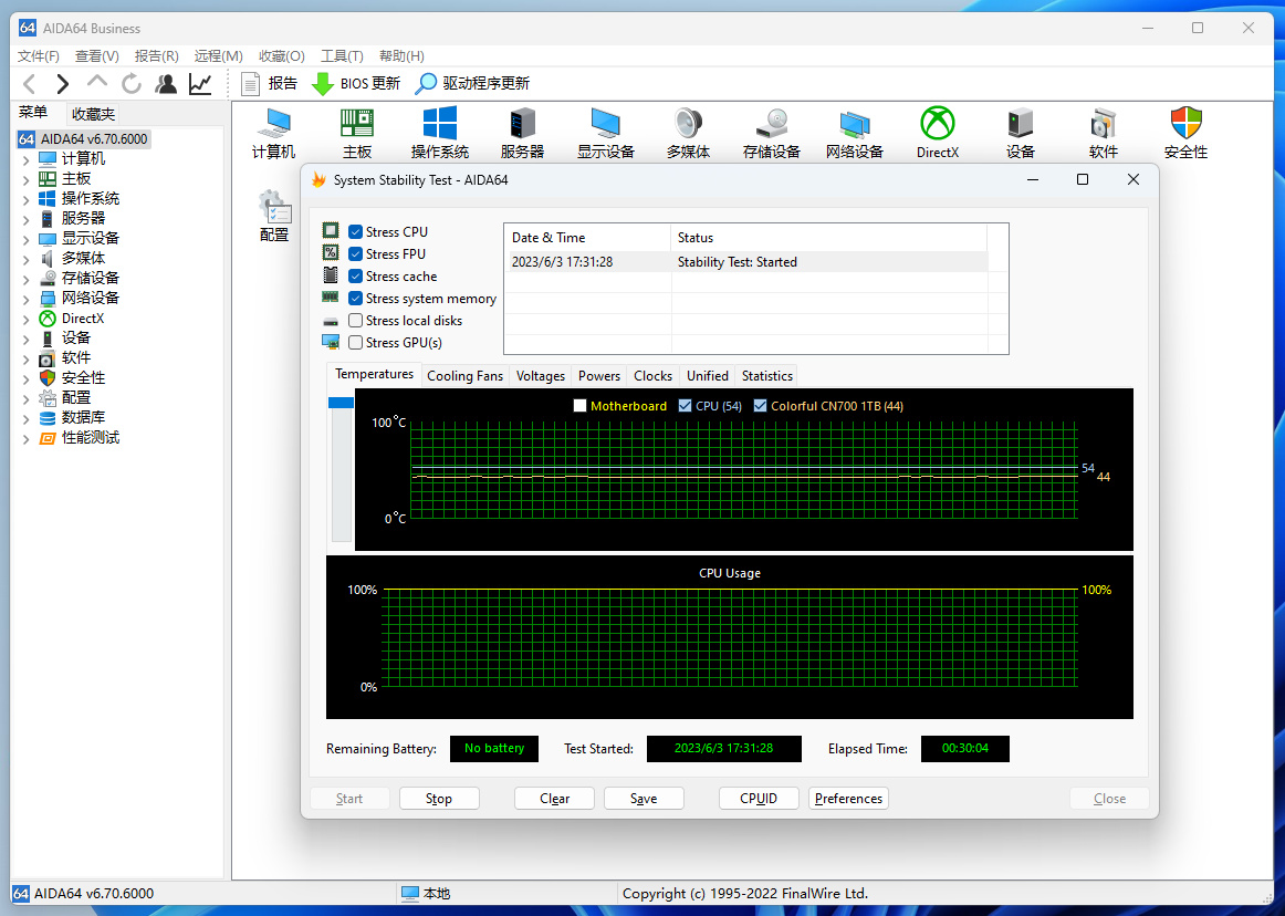 測試使用AIDA64的壓力測試工具,主要監控CPU的溫度變化,比較遺憾的是看不到具體每個核心的溫度,測試結果如下圖所示: