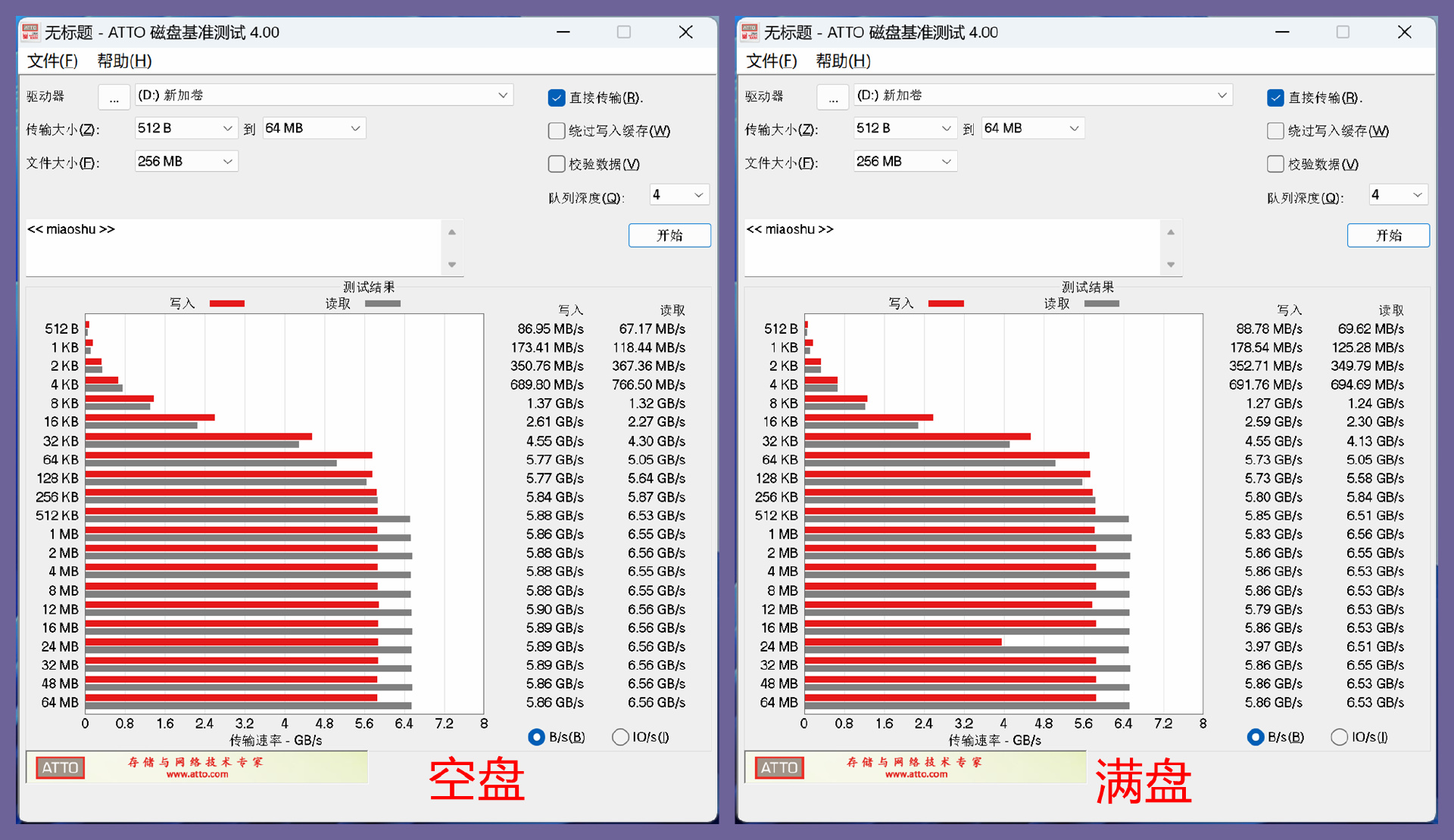 空盘与满盘状态下,ATTO磁盘基准测试的结果如下图所示,可以看到当文件大小在64KB以上时候,金百达KP260 Plus已经能维持在顺序读写性能方面的稳态了。