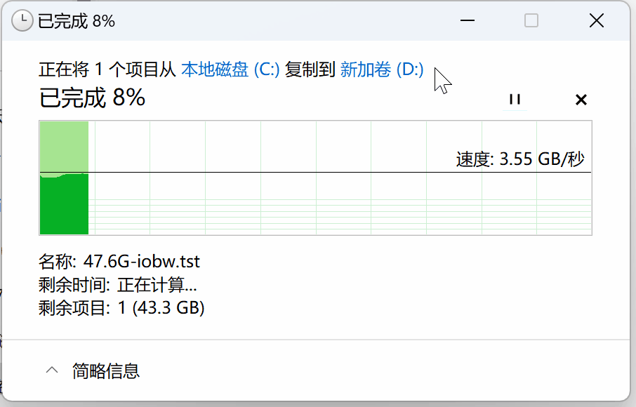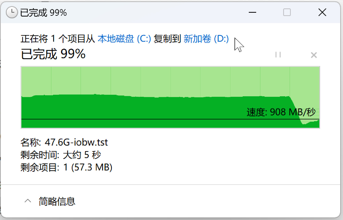 在95%占用的情况下,使用47.6G大小的单个大文件对其进行实际粘贴操作,性能表现也与HDTune Pro的测试结果一致。所以看到这里,朋友们就不用担心这块盘在高占用下的性能表现了,即使接近满盘性能释放也依然非常积极。